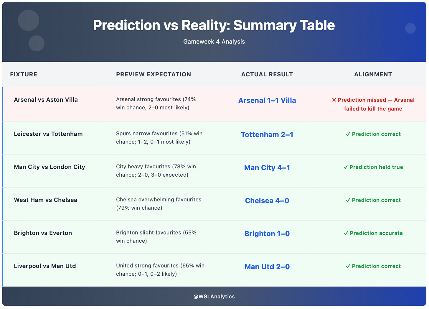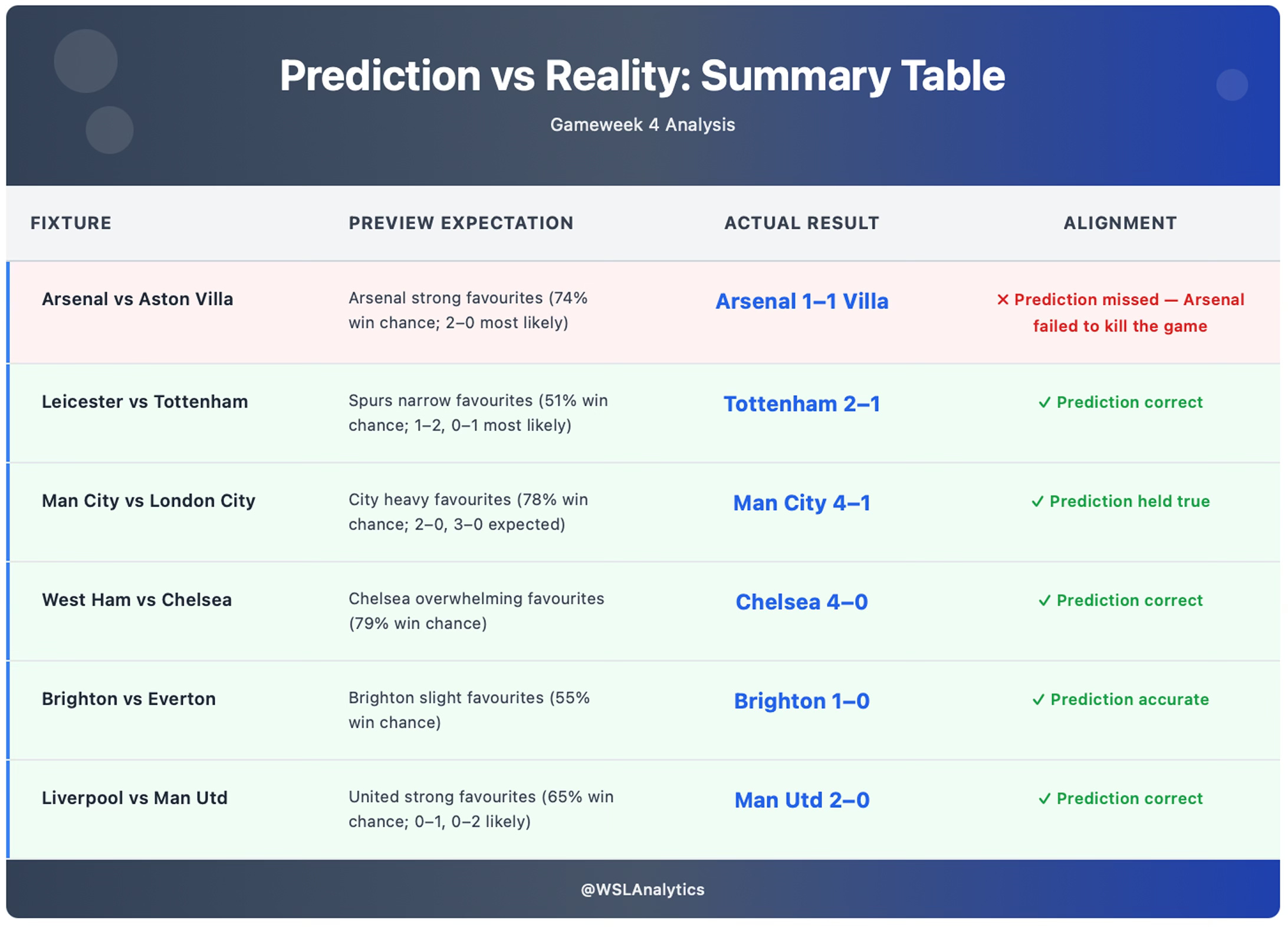 Gameweek 4 offered fireworks at both ends of the table. Our preview leaned on Chelsea and City to deliver — and they did emphatically, with 4–0 and 4–1 routs that underlined their firepower. Manchester United also justified the model with a professional derby win, while Tottenham’s gritty bounce-back at Leicester tracked closely with our probabilities.