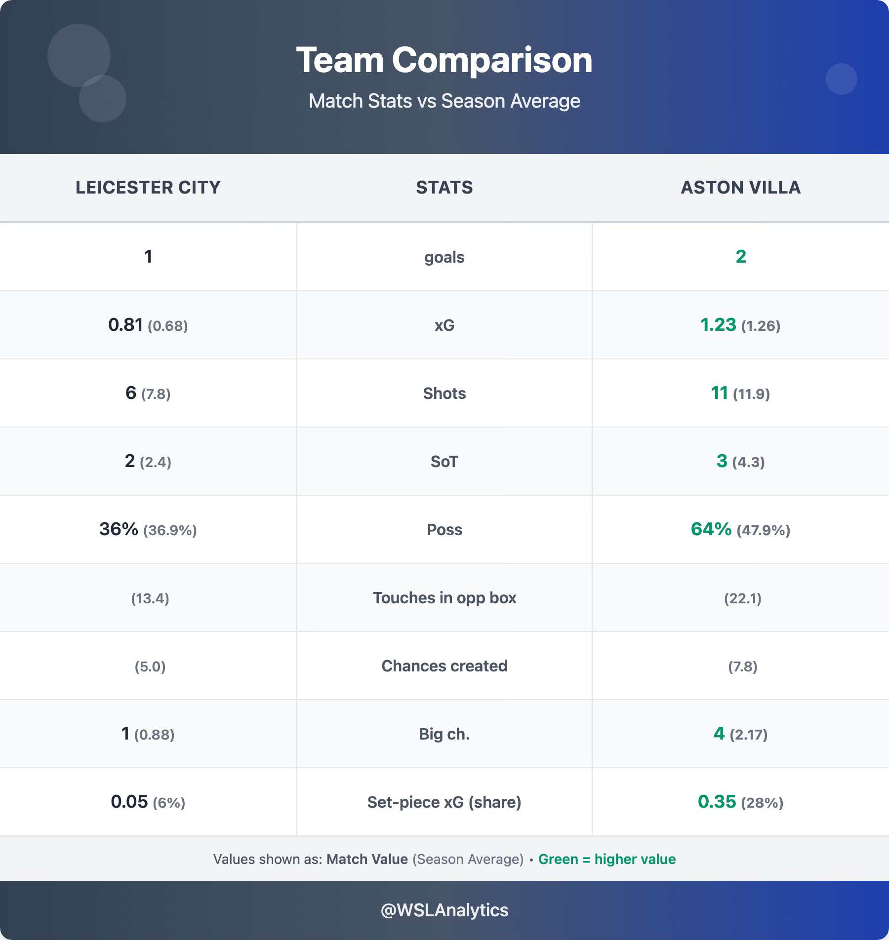 Aston Villa controlled the match despite falling behind. Their 1.23 xG was close to their 1.26 season average, with 11 shots, 3 on target, and an impressive 4 big chances (vs a 2.17 average – nearly double). The second-half response – two goals in the final 40 minutes – showed a resilience that has been absent in recent weeks. Kirsty Hanson’s winner was her 10th of the season.