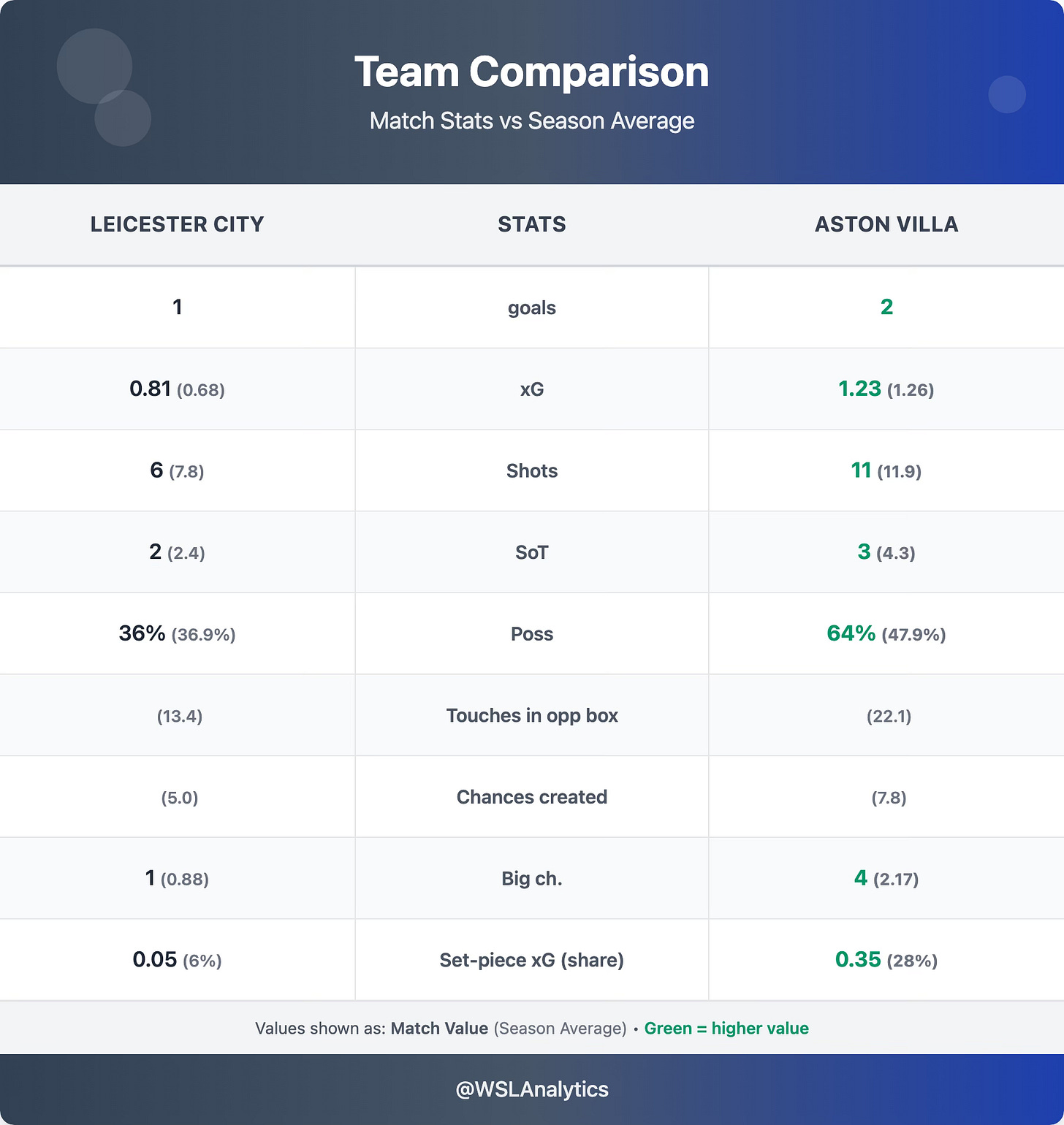 Leicester City’s attacking limitations were exposed once again. Their 0.81 xG was actually above their 0.68 season average – largely thanks to the Lehmann goal – but just six shots, two on target, and one big chance, with virtually all of their threat coming in the first half, tells the story of a side unable to sustain attacking pressure.