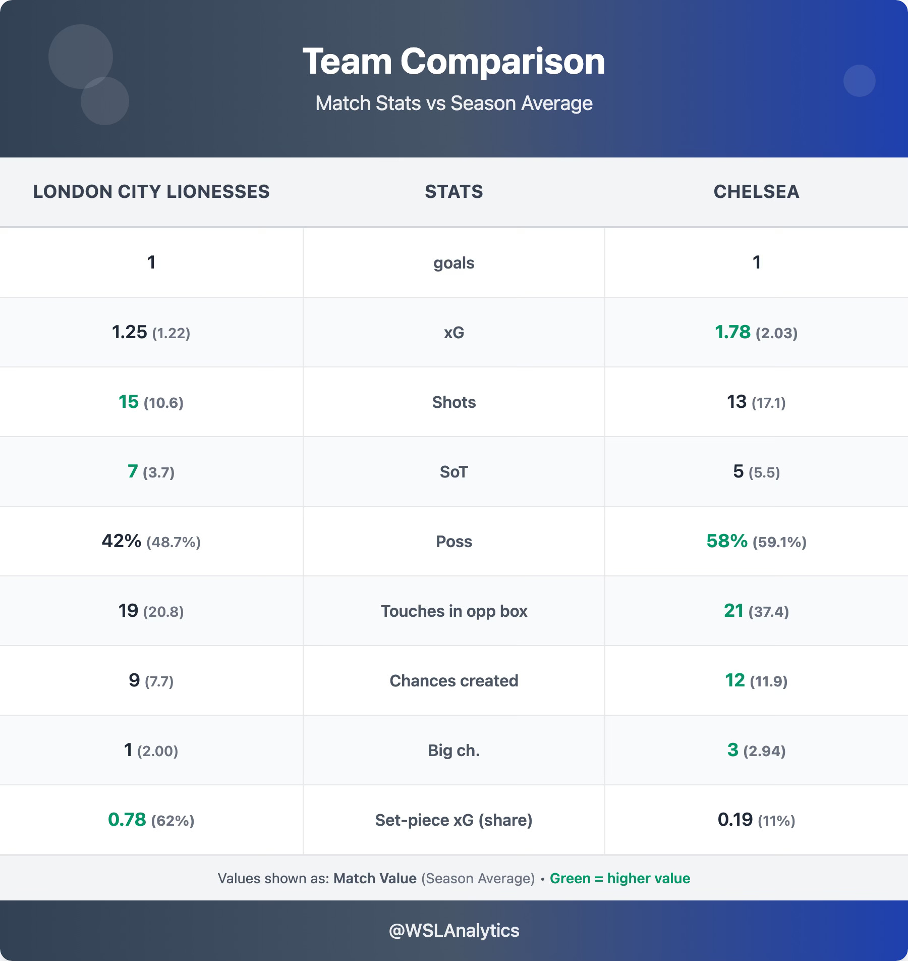 London City Lionesses produced one of their best performances of the season – and the second half was transformative. An astonishing 14 of their 15 shots came after the break, completely flipping the pattern of the match. Their 1.25 xG was above their 1.22 average, with 15 shots (vs 10.6) and 7 on target (vs 3.7) – nearly double their usual output. They created 9 chances (vs 7.7 average). The equaliser was thoroughly merited.