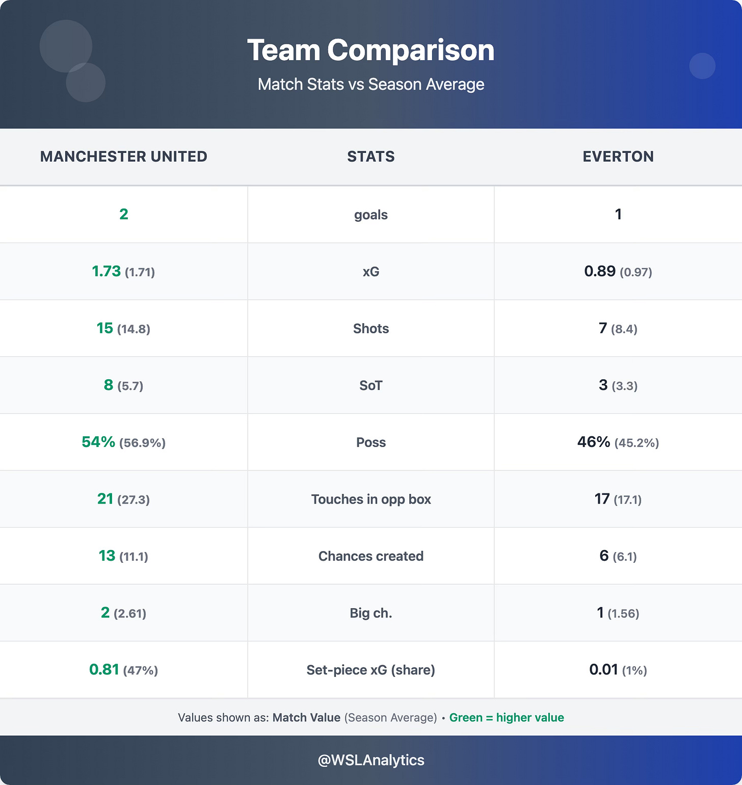 United were back to somewhere near their best after the frustrating draw at West Ham. An xG of 1.73, right in line with their 1.71 season average. They had 15 shots, eight on target (well above their 5.7 average), and 13 chances created (vs 11.1). The set-piece threat was particularly notable – 0.81 xG from set pieces, accounting for 47% of their total, which validated our preview’s identification of Everton’s aerial vulnerability as a key battleground. Crucially, the winning goal also came from a corner, further underlining how decisive set pieces proved.