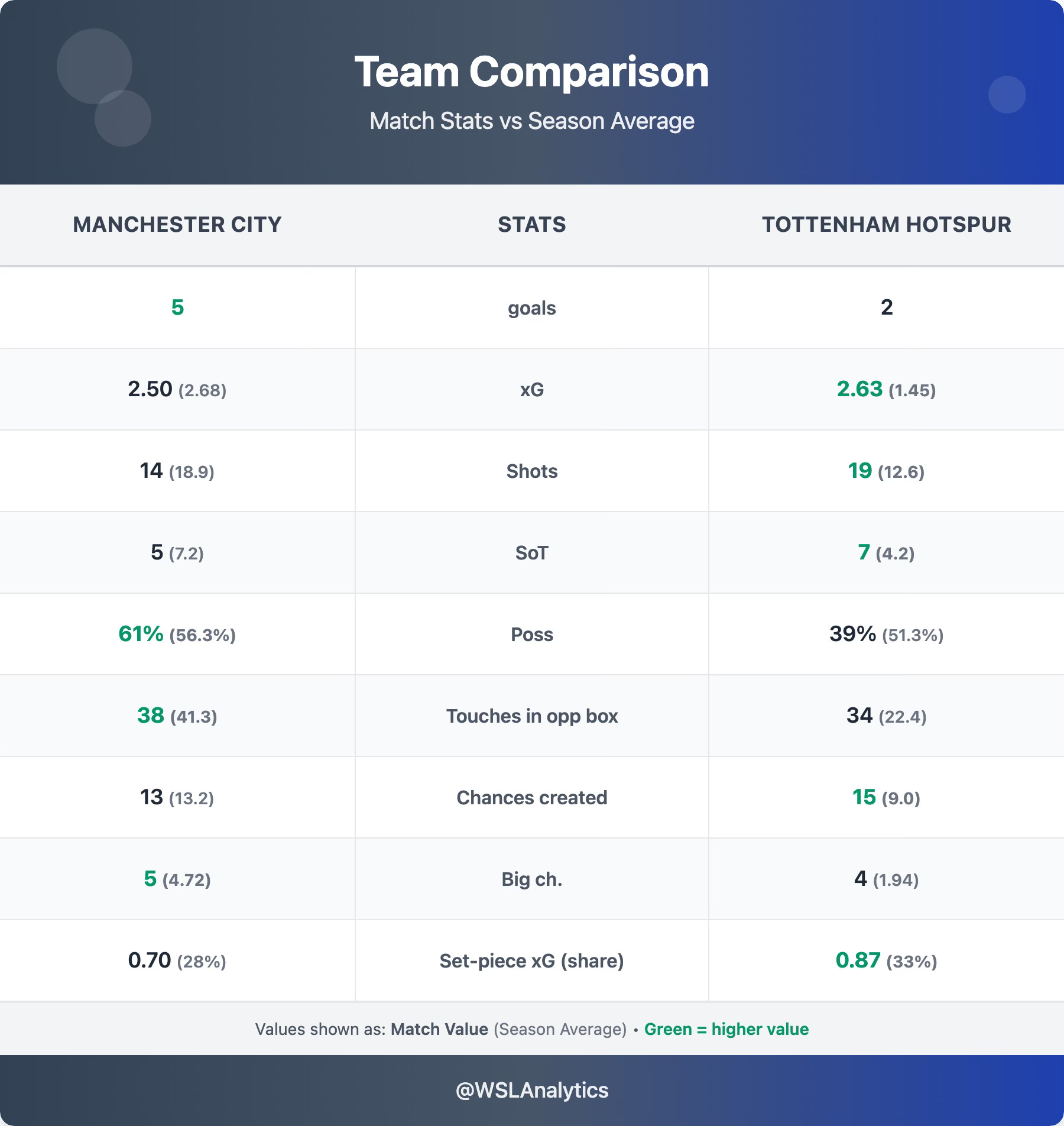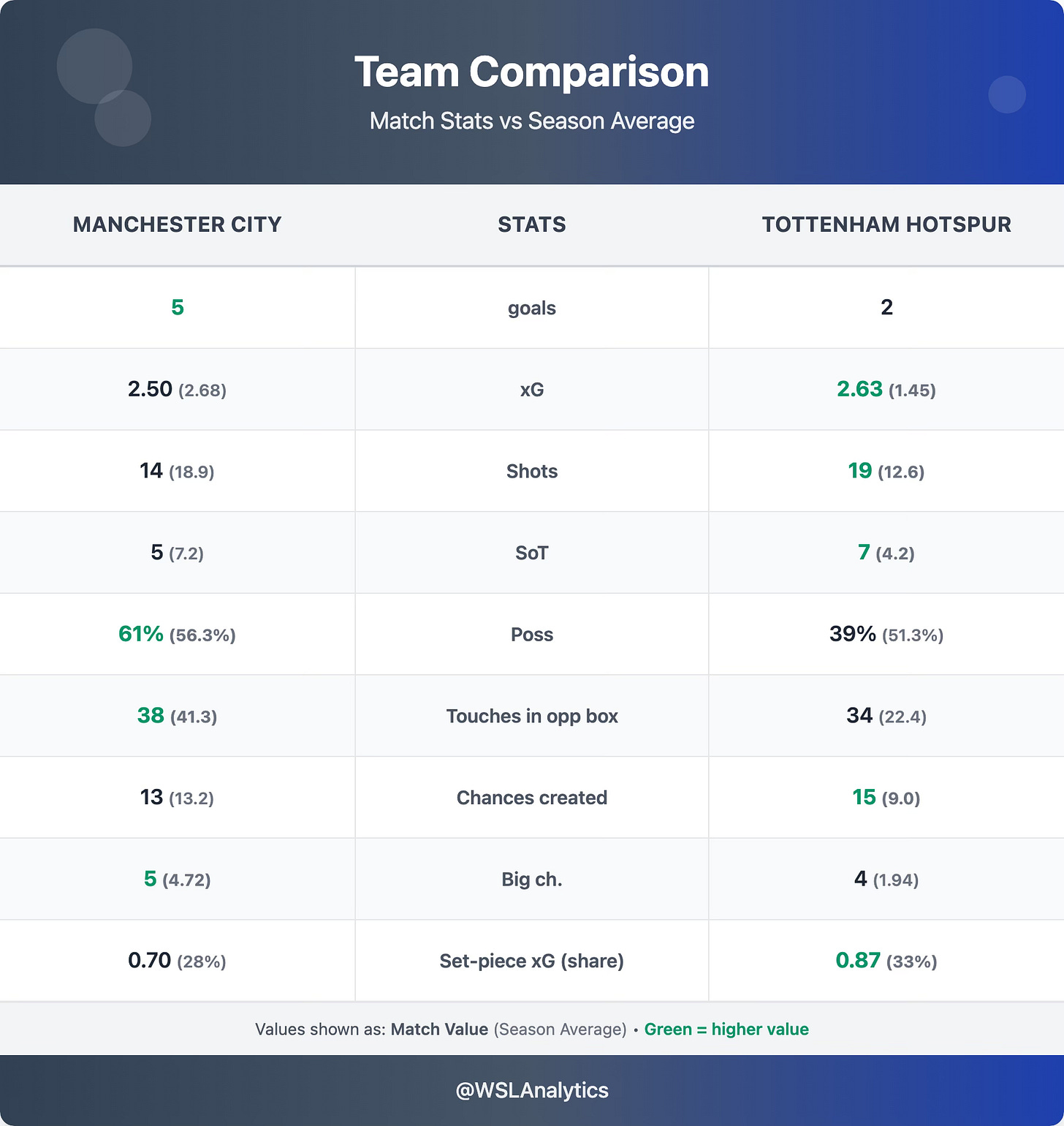 Tottenham actually posted remarkable attacking numbers in defeat. Their 2.63 xG was nearly double their 1.45 season average, with 19 shots (vs 12.6 average), 7 on target (vs 4.2), and 15 chances created (vs 9.0). They also had 34 touches in the opposition box – well above their 22.4 average – and created 4 big chances (vs 1.94). This was far from a one-sided encounter; Spurs simply could not contend with City’s lethal finishing in the opening half-hour.