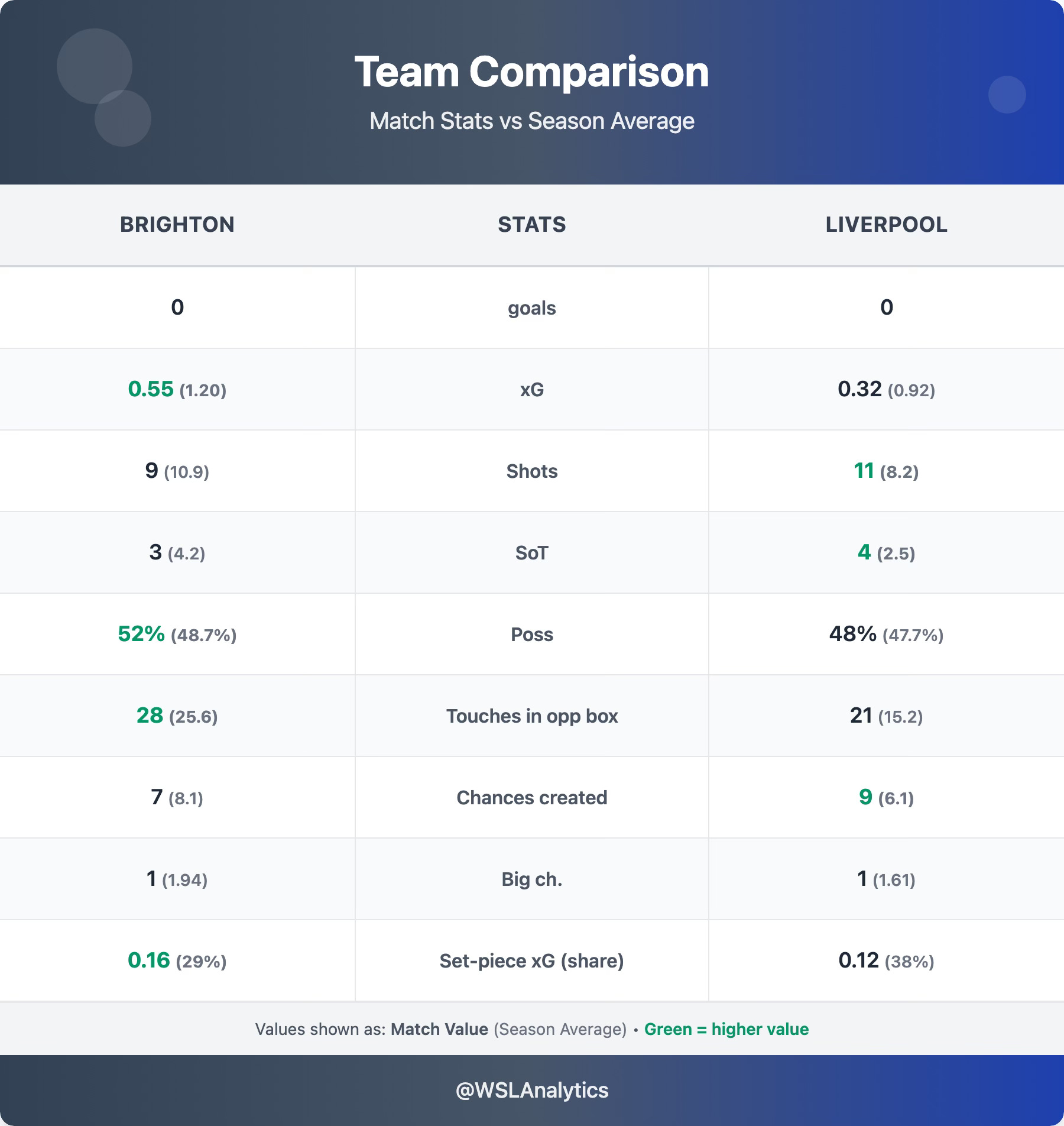 Liverpool were limited in attack but resolute defensively. Their 0.32 xG was well below their 0.92 average, but they actually had more shots (11 vs 9), more shots on target (4 vs 3), and created more chances (9 vs 7) than the home side. The lack of quality on both sides was the overriding theme, with 0.87 combined xG making this the lowest-quality match of the weekend.