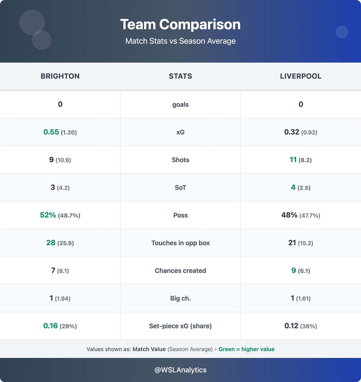 Brighton and Liverpool played out a goalless draw at Broadfield Stadium – a match that produced just 0.87 combined xG, comfortably the lowest total of the weekend. Liverpool extended their unbeaten run to four matches and have now taken 10 points from their last six WSL games – losing only to Manchester United and Chelsea – while Brighton’s winless streak stretched to four.