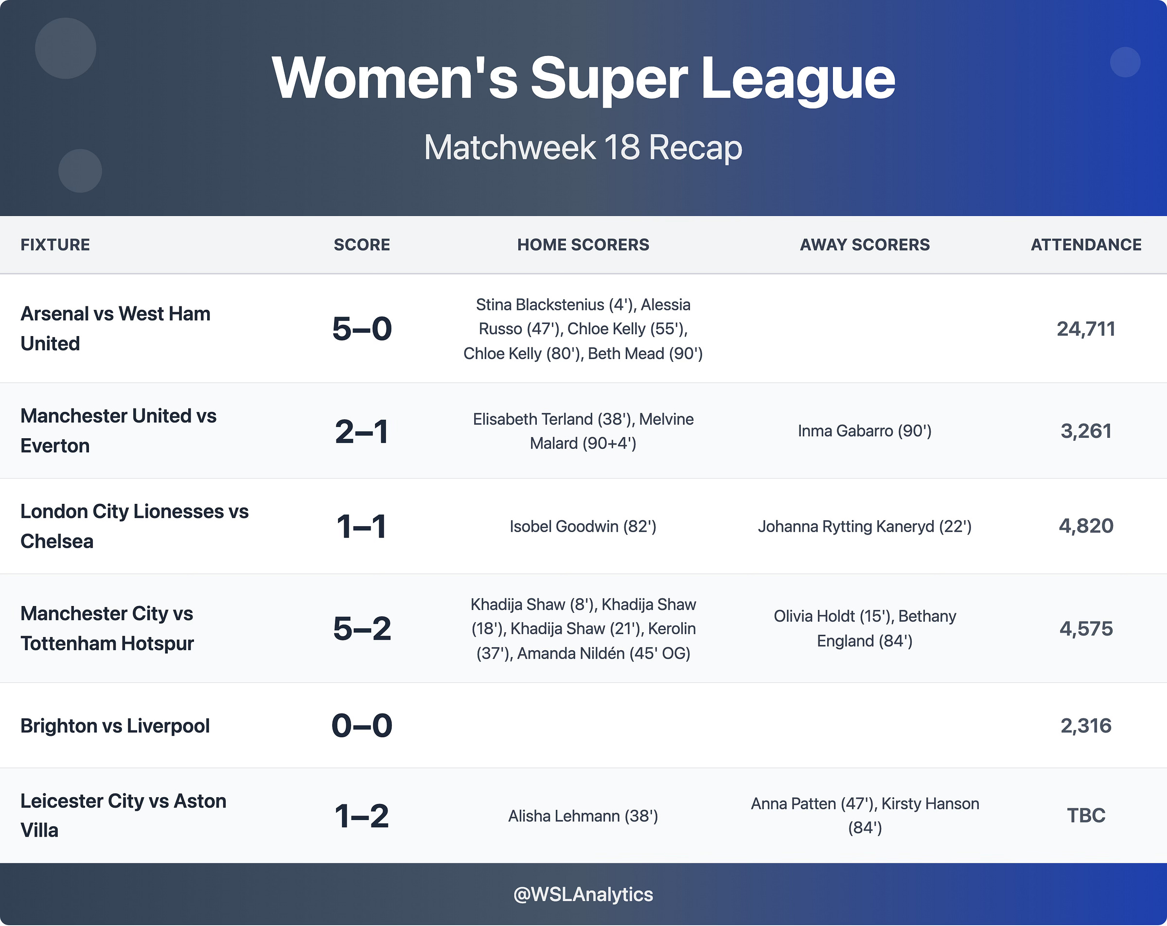 WSL 2025–26 Matchweek 18 Recap – Shaw Hat-Trick Fires City Past Spurs as Five Star Arsenal Demolish West Ham