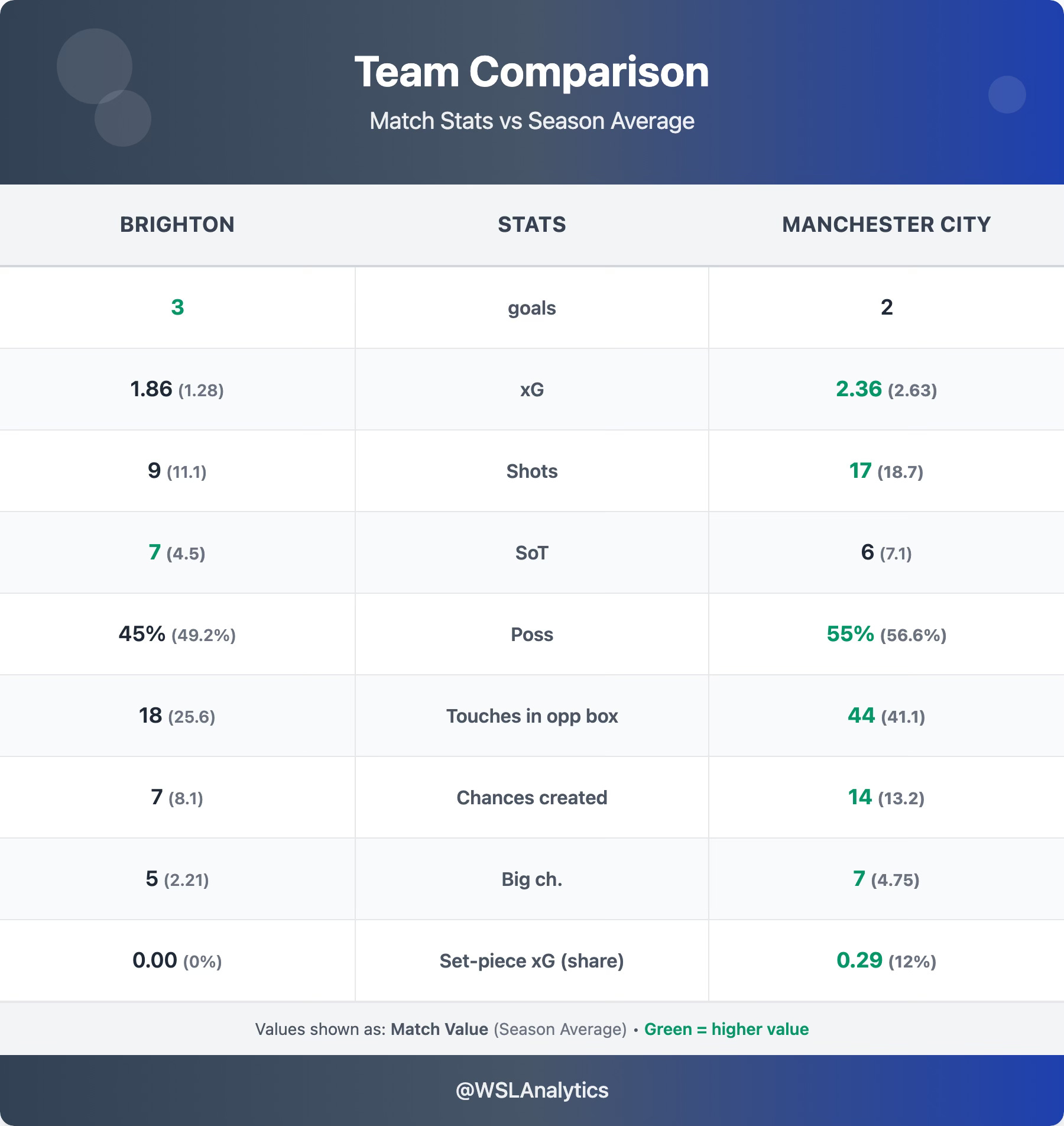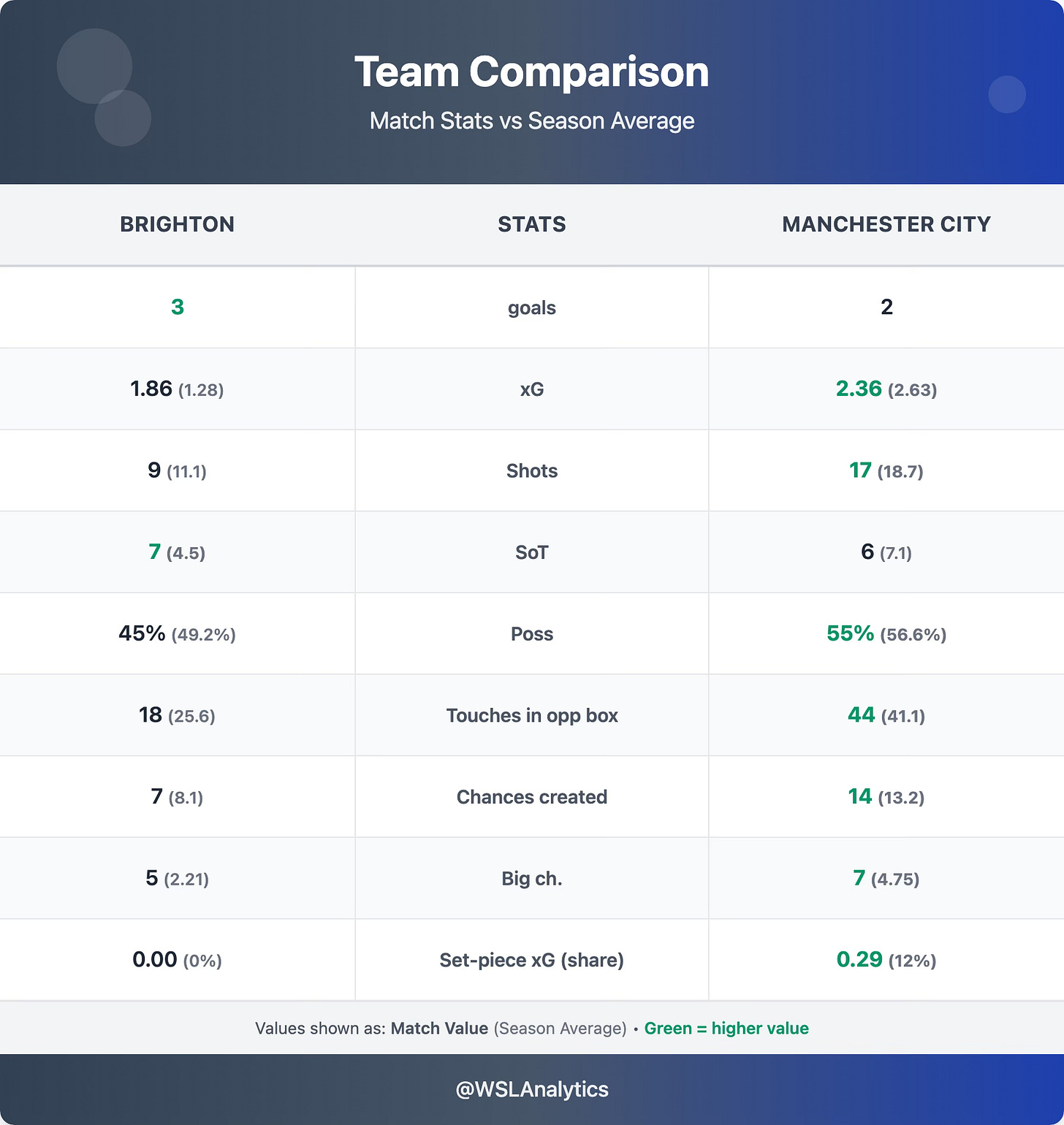 Brighton were below their season averages on almost every metric – fewer shots, less territory and less possession – but the standout was their efficiency: 7 shots on target from just 9 attempts. Three found the net against the league leaders.