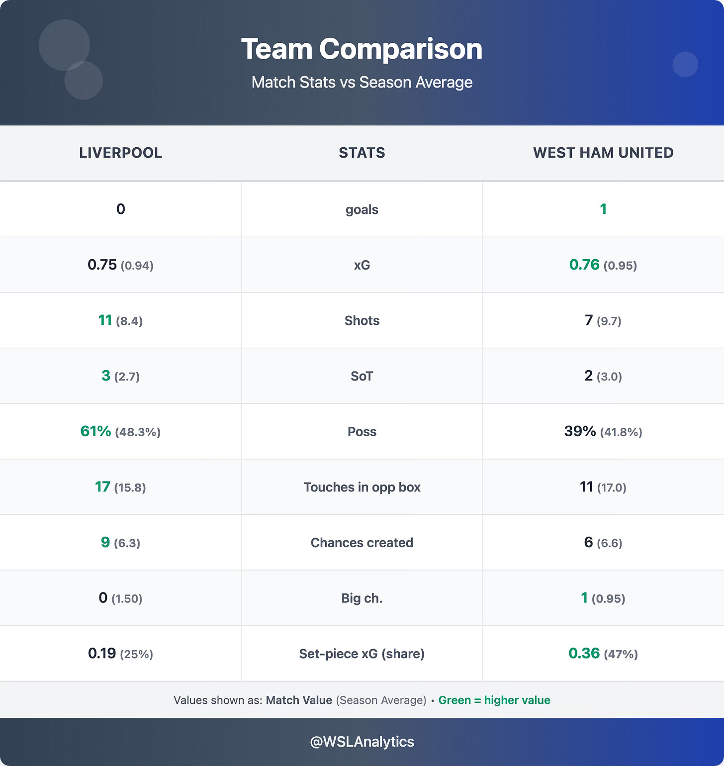 West Ham’s attacking metrics were not great – in fact, they were below their already modest averages in most areas. But they were defensively disciplined, which is commendable for a side that has conceded 41 goals this season. They were also ruthless when it mattered, converting the set-piece opportunity that ultimately decided the game.