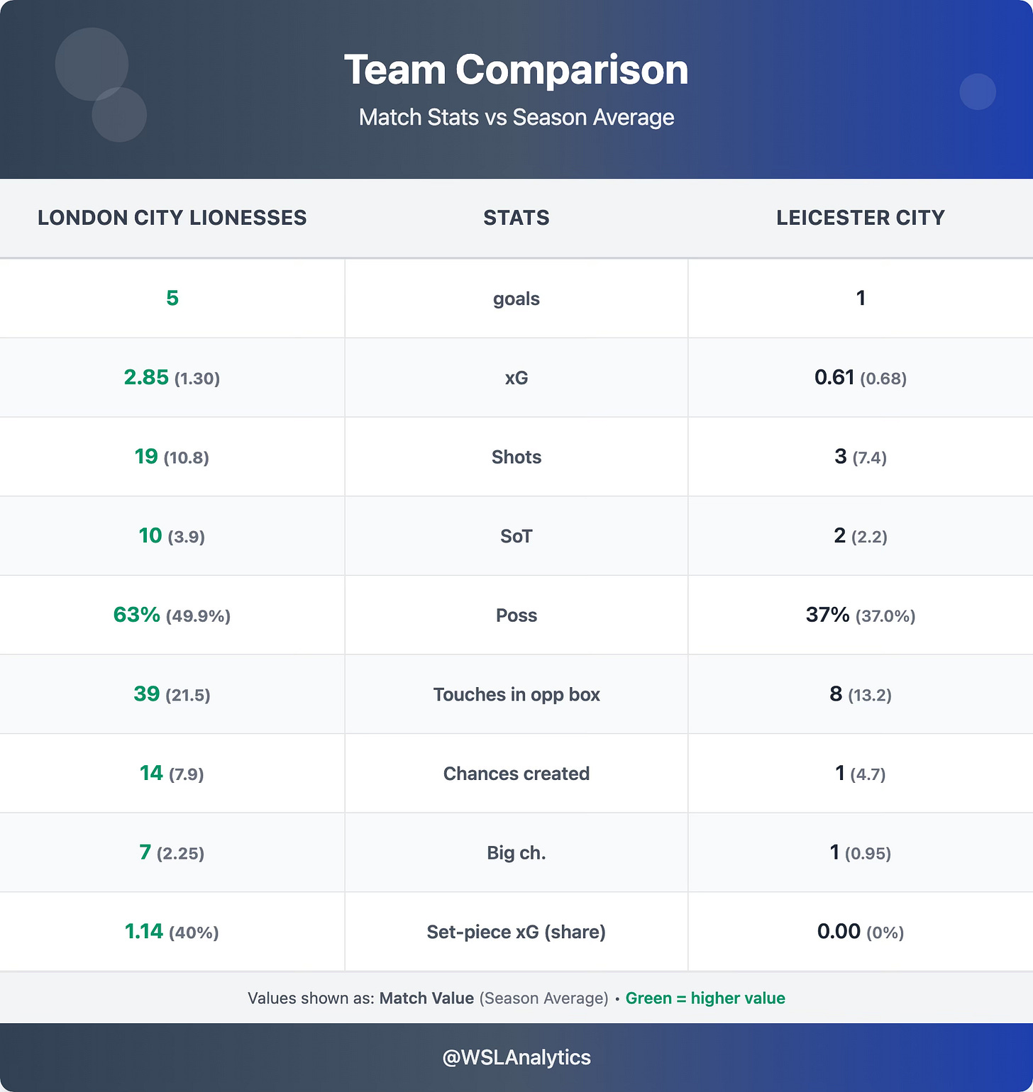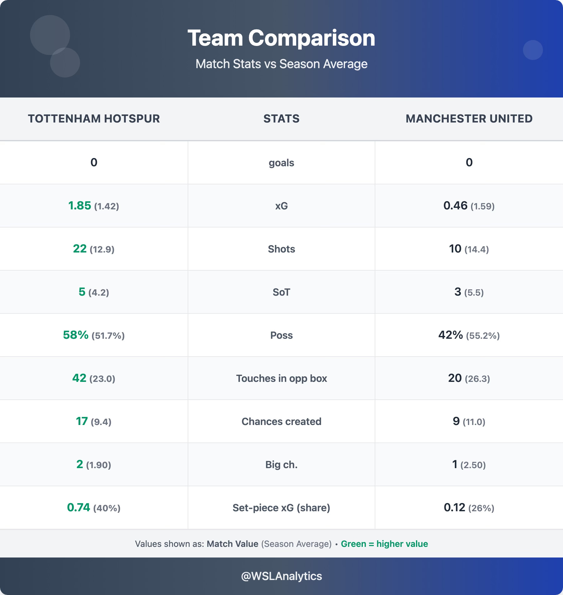 Tottenham produced one of their most dominant attacking displays of the season. They were above their season averages for shots, chances created and territory – but couldn’t find a way past Phallon Tullis-Joyce. The standout stat was their shot volume: 22 shots, their second-most in a single match this season after the 27 they registered against Villa.