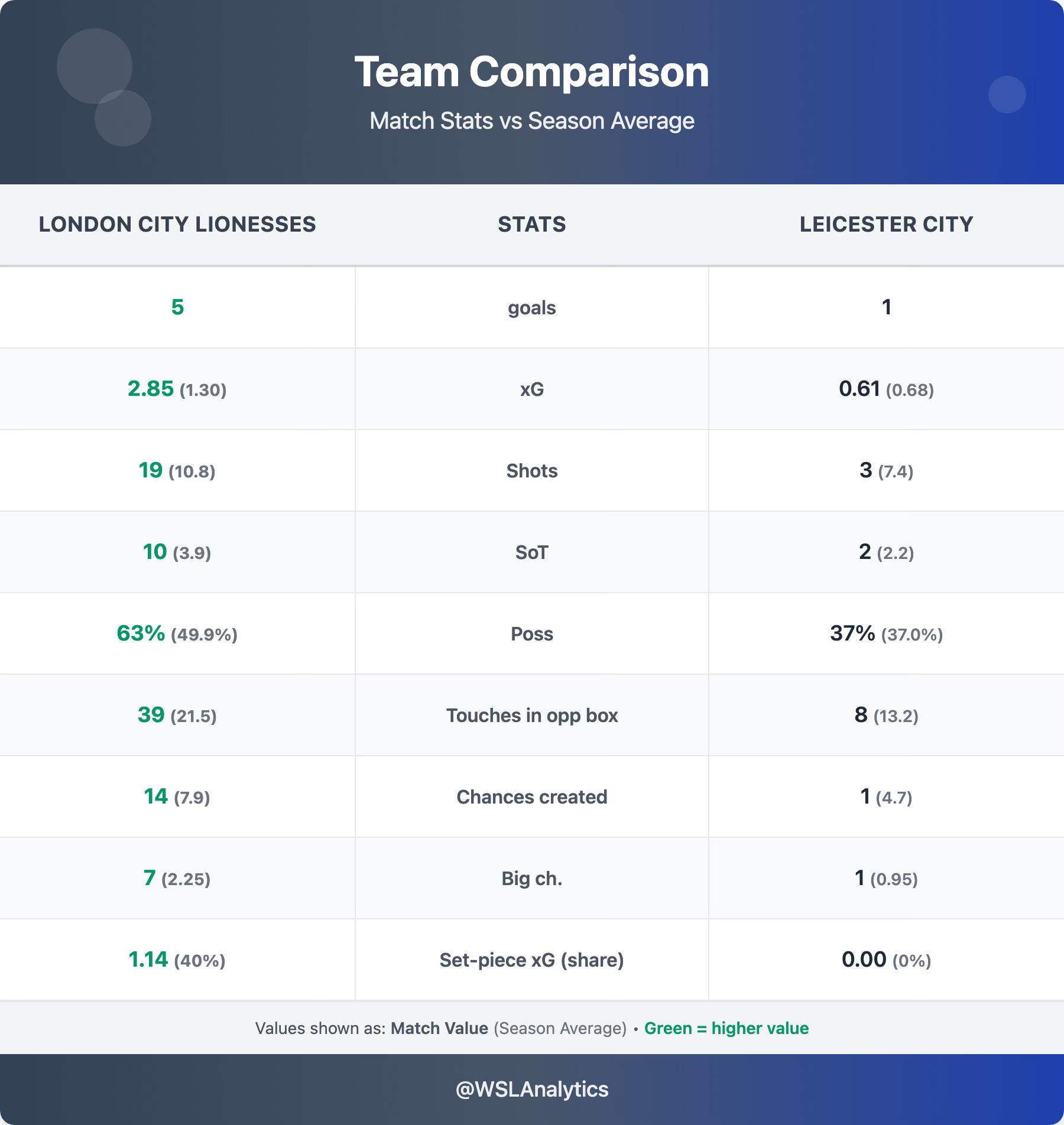Leicester’s 0.61 xG was almost exactly in line with their 0.68 season average – but they managed just 3 shots, 8 touches in the opposition box, below their 13.2 average, and 1 chance created, well below their 4.7 norm. Their cumulative WSL attacking numbers remain the lowest in the division by a wide margin.