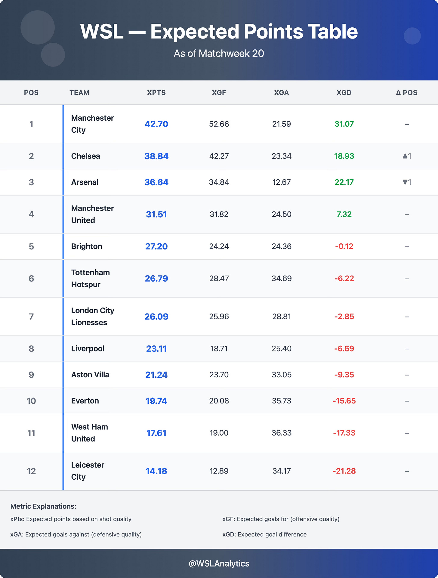 Brighton’s defeat of City makes for an interesting xPts story: they took 3 actual points, but their xGD turned negative, moving from +0.24 to −0.12. Their 1.86 xG was good, but conceding 2.36 to City means the win, in underlying terms, was earned through clinical finishing rather than territorial control. They stay 5th in xPts.
