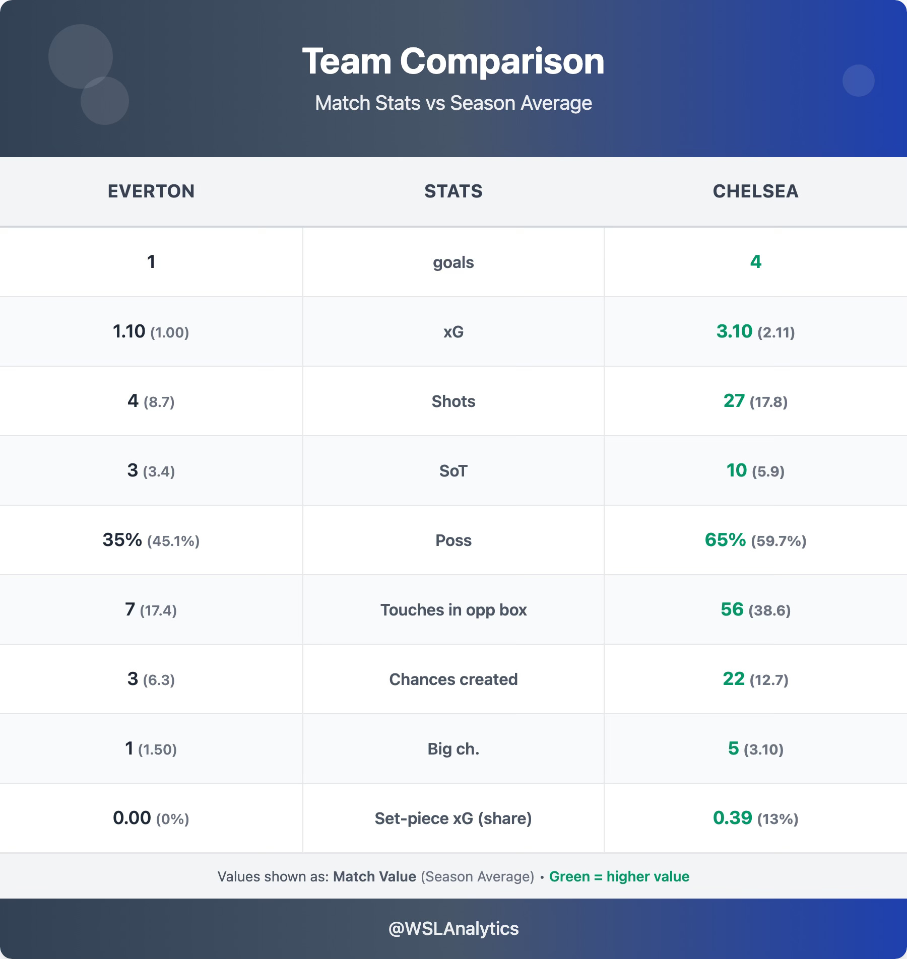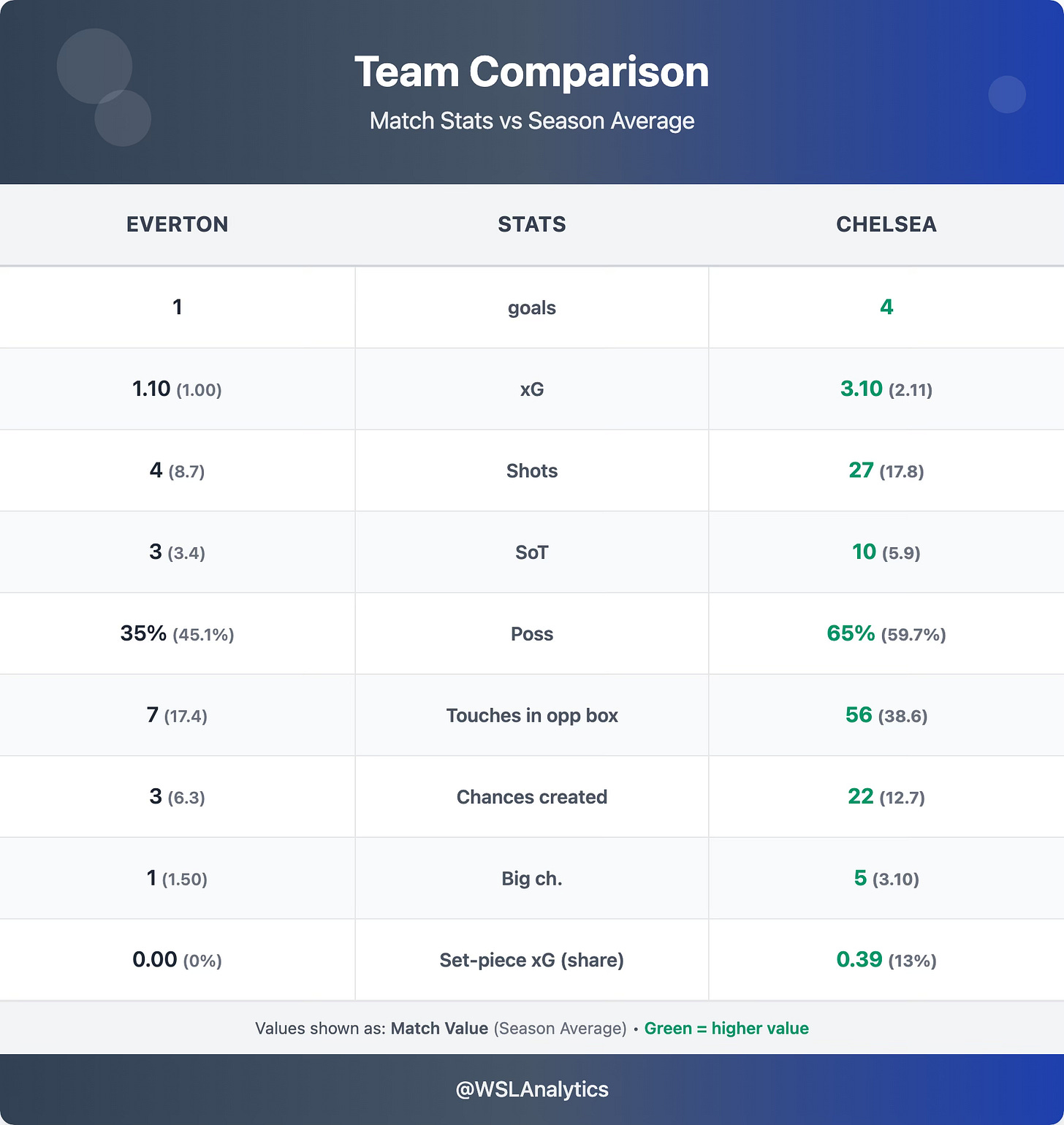 Our preview made Chelsea modest favourites at 54%, with set pieces flagged as the key battleground. In the end, Chelsea did not need them: all 4 goals came from open play, although set pieces still accounted for 13% of their total xG.