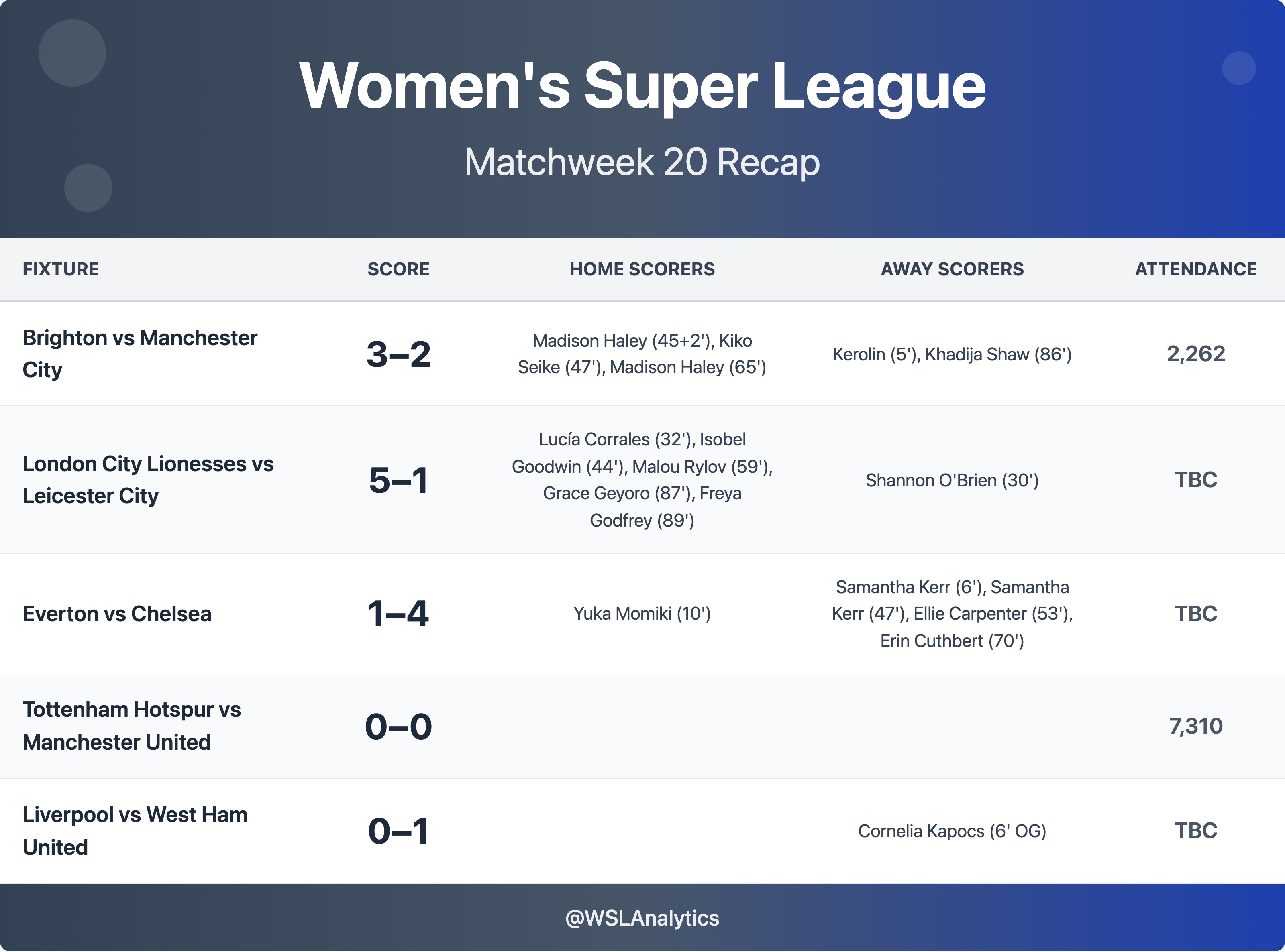 The biggest headline came at Broadfield, where Madison Haley scored twice and Kiko Seike struck a third as Brighton stunned Manchester City 3–2 from a goal down – only City’s third league defeat of the season. The result delays the title clinch and keeps Arsenal mathematically alive with three games in hand. Andrée Jeglertz’s side now need maximum points from their final two fixtures to be sure.