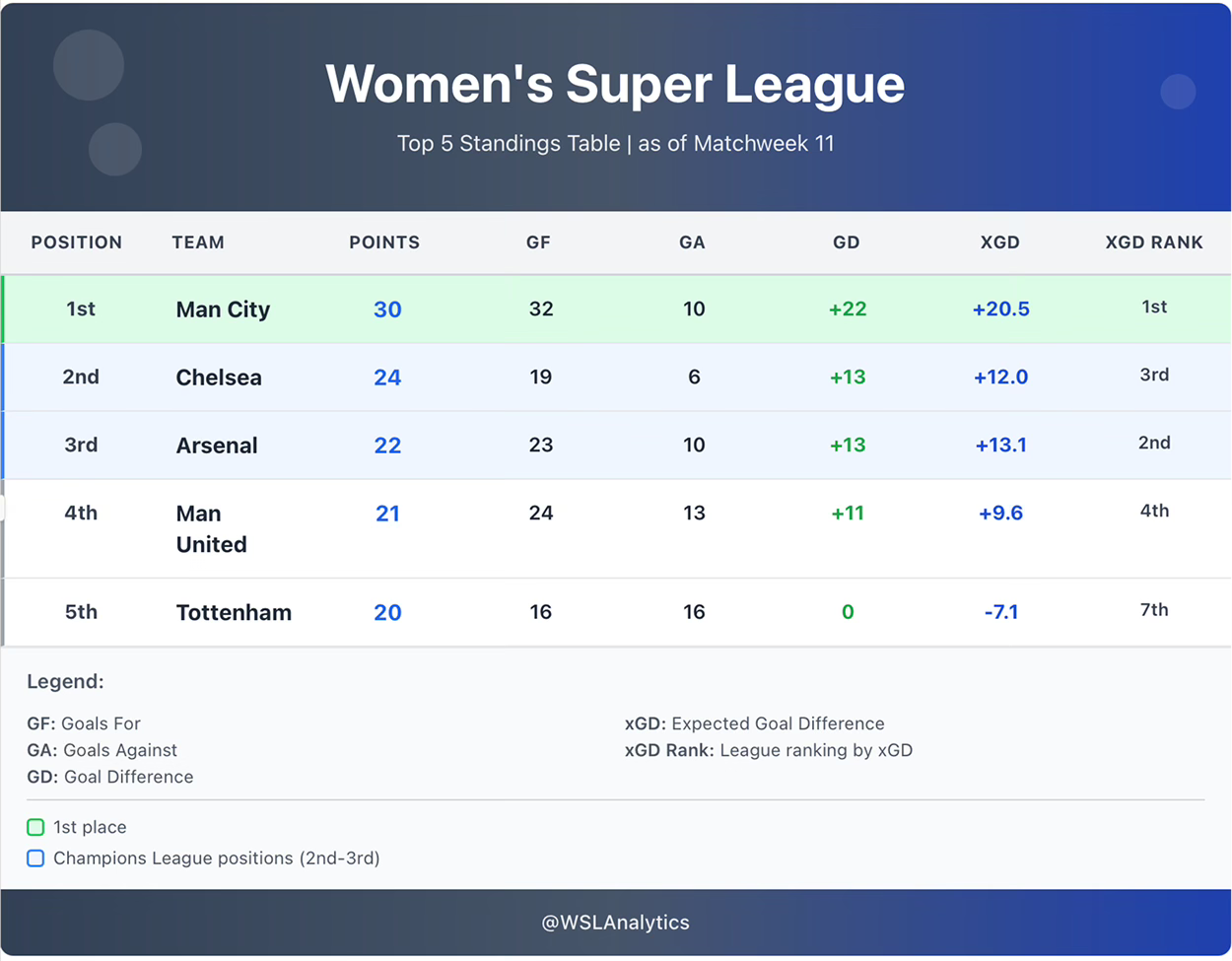 The second half will test whether process trumps results: will regression to the mean catch up with Tottenham’s overperformance while rewarding Arsenal and United’s superior metrics? Or can clinical finishing and defensive grit continue to defy the data? One thing is clear – there’s no single blueprint for success in this season’s WSL, and that unpredictability makes the race compelling.