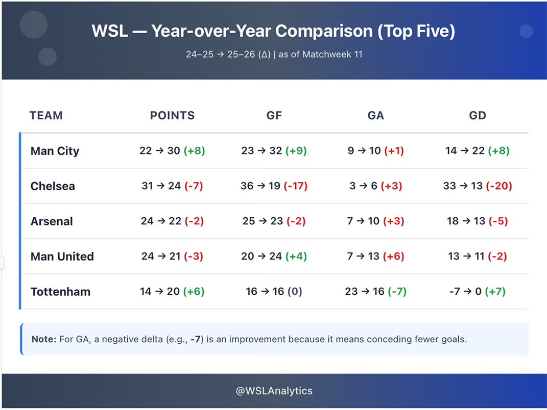 Year-over-year comparison reveals dramatic swings: Chelsea’s 17-goal collapse, City’s 9-goal improvement, and Tottenham’s defensive transformation (-7 goals conceded).