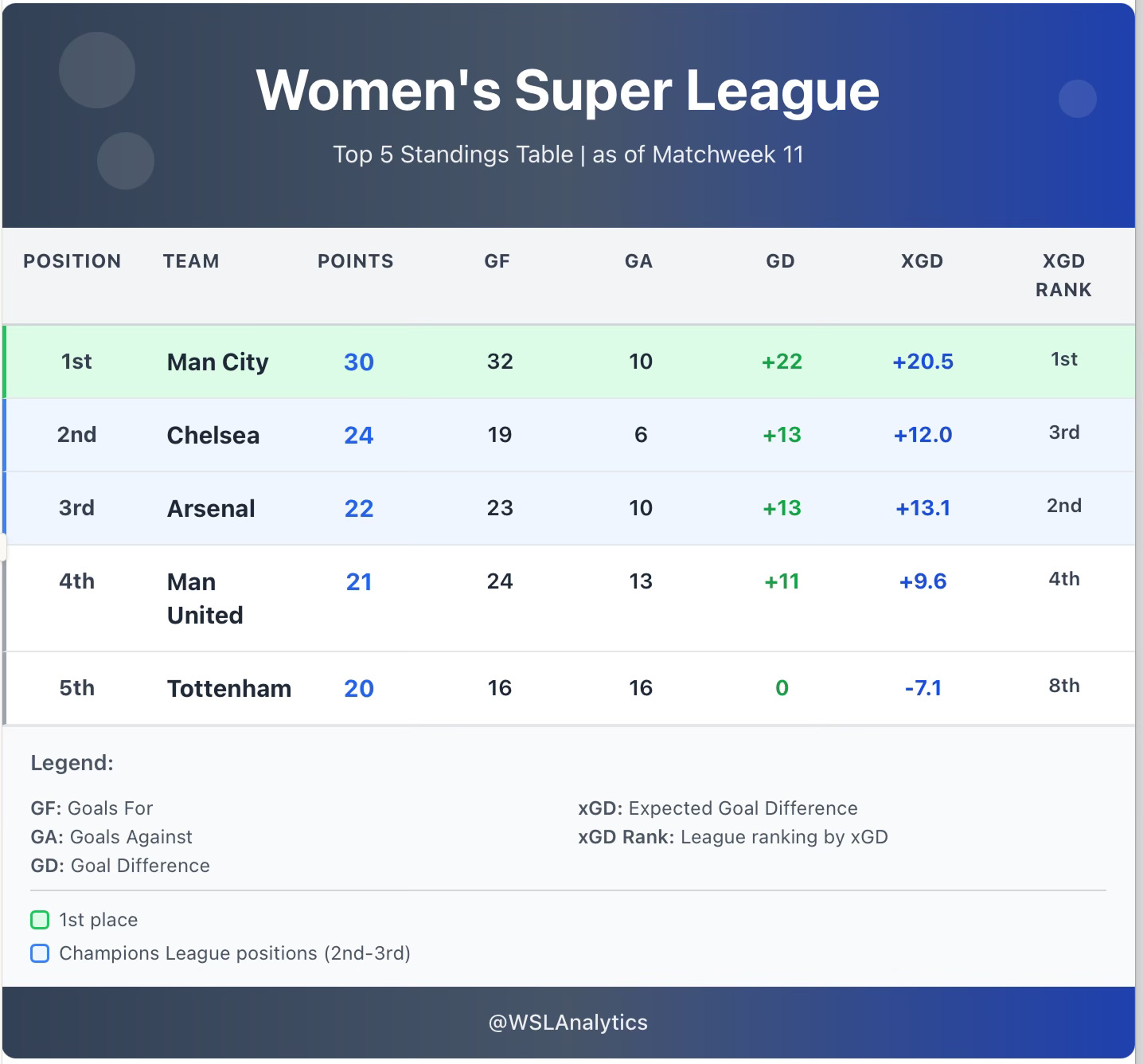 The second half will test whether process trumps results: will regression to the mean catch up with Tottenham’s overperformance while rewarding Arsenal and United’s superior metrics? Or can clinical finishing and defensive grit continue to defy the data? One thing is clear – there’s no single blueprint for success in this season’s WSL, and that unpredictability makes the race compelling.