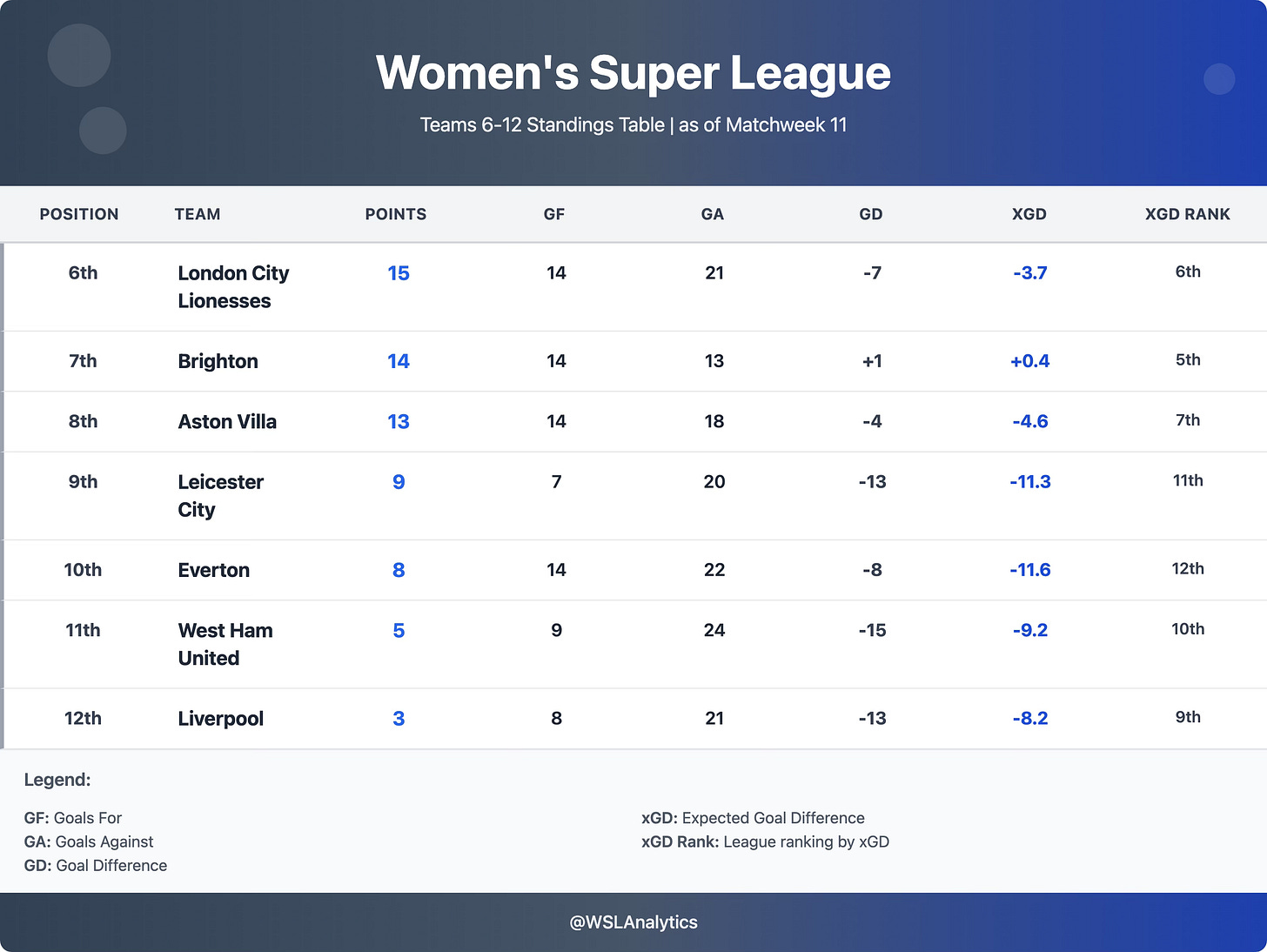 The middle and bottom of the WSL table tells a story of fine margins and fragile foundations. London City, Brighton, Villa, and Leicester are separated by just six points – a gap small enough that three results could reshape the mid-table picture. But the process table complicates the surface narrative: Brighton’s +0.4 xGD and 5th-place xGD rank suggests a stronger platform than their league position, while Everton’s –11.6 xGD and 12th-place xGD rank highlights just how fragile their current points total is.