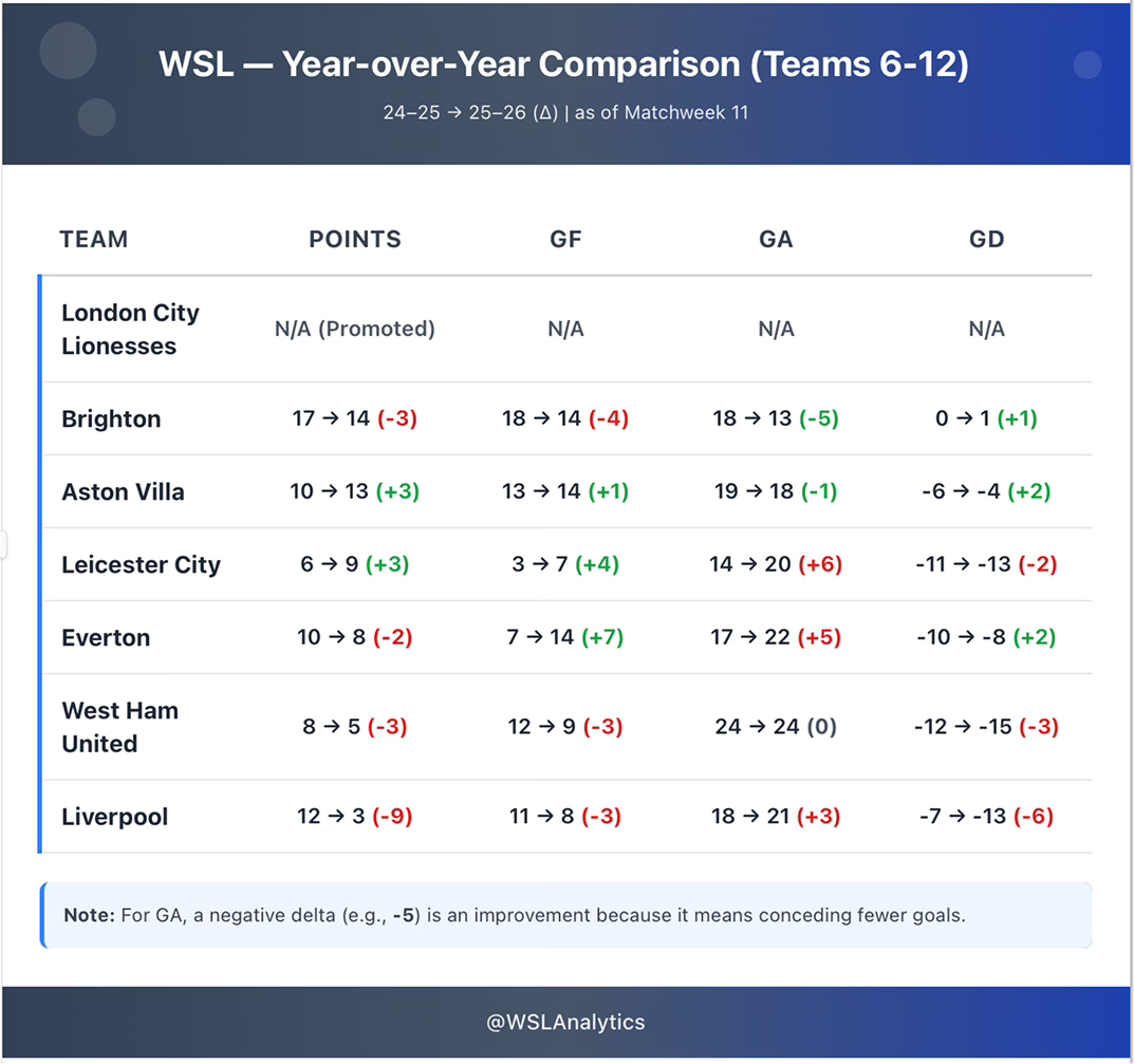 Year-over-year comparison highlights three defining swings in the bottom half: Everton’s attack surge (+7 GF), Liverpool’s points collapse (–9 points), and Brighton’s defensive reset (–5 GA).