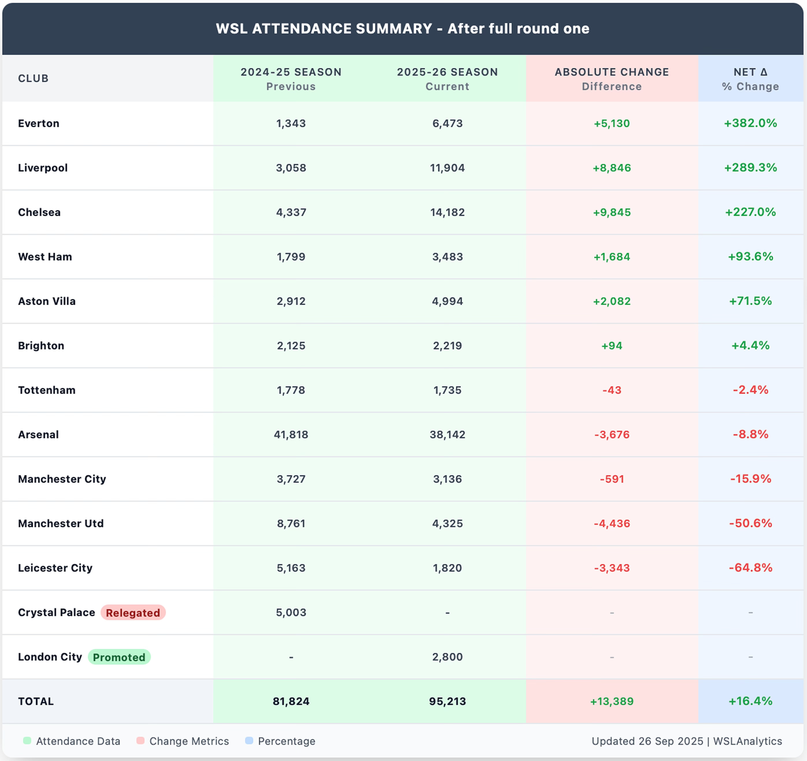 After Round 1 of 2025–26, the WSL’s attendance trajectory looks encouraging. The league drew 95,213 in total, up from 81,824 last season — a +16.4% rise. Multiple clubs posted gains, though growth wasn’t universal.