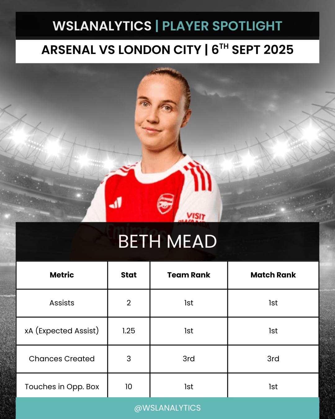 Mead made just 14 minutes count, earning an 8.6 rating. She delivered two late assists (83’ & 84’), posted a match-high 10 touches in the box, and created 1.25 xA worth of chances. A decisive cameo that sealed Arsenal’s win.