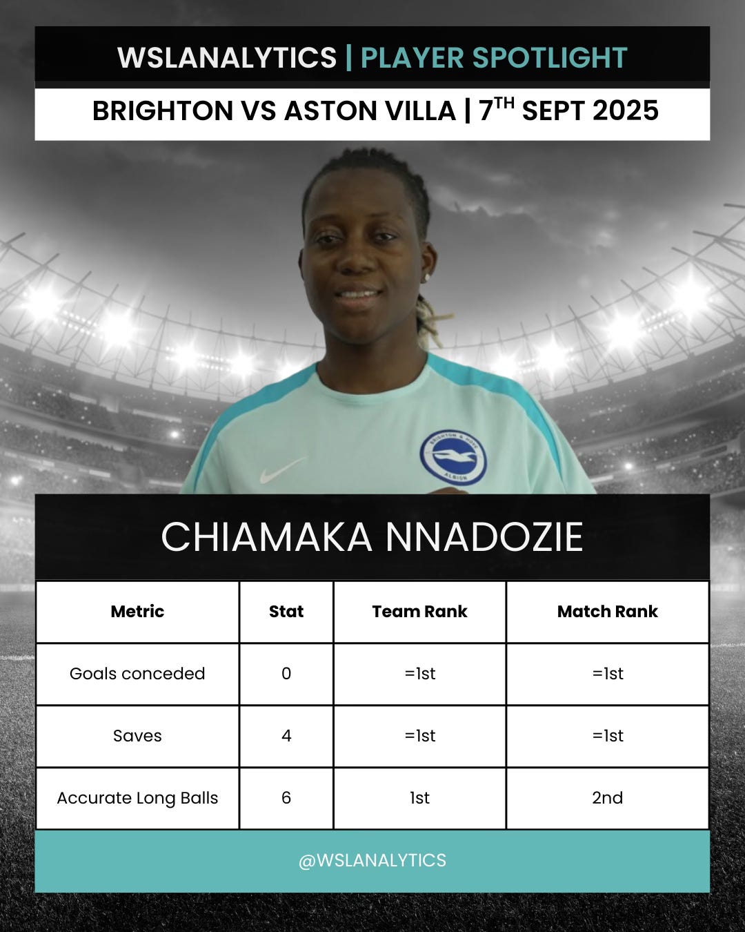 On her WSL debut, Nnadozie was immense — 4 saves and a clean sheet against Villa. Added 6 accurate long balls to spark attacks. A commanding first outing for Brighton’s new No.1.