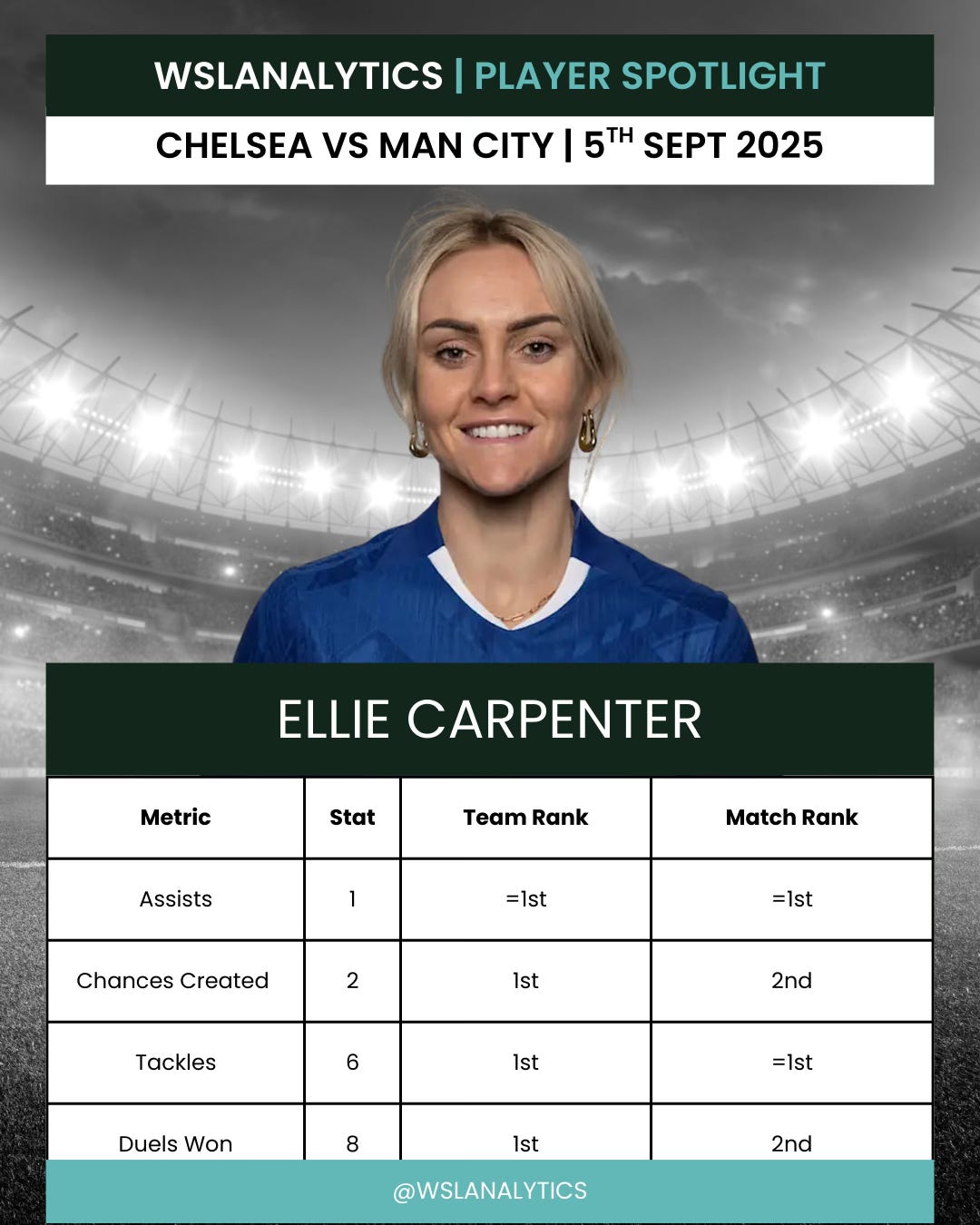 Carpenter delivered an outstanding two-way performance, which earned her a match-high 9 rating. She was instrumental in defense – shutting down City’s right flank – while also contributing an assist going forward.