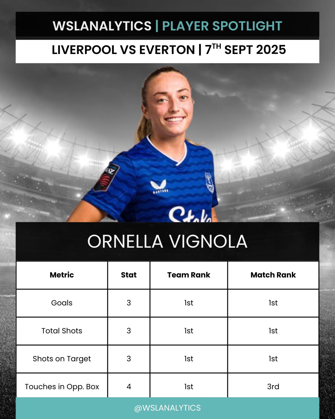 A derby debut to remember — 3 goals from 3 shots for the perfect hat-trick efficiency. Added 4 touches in the box as she constantly threatened Liverpool’s back line. Clinical, ruthless, unstoppable at Anfield.