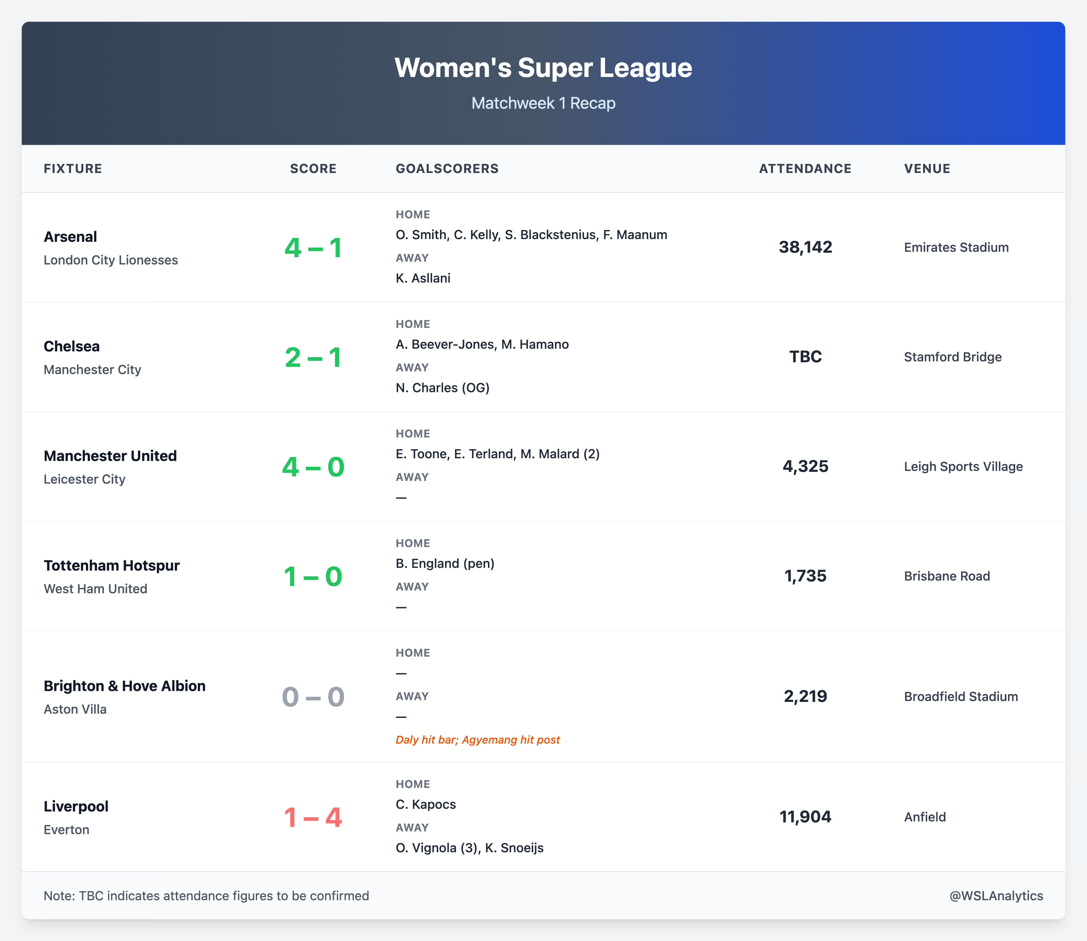 Matchweek 1 set the tone for an unpredictable WSL season: a title clash (Chelsea–City), a debut (London City), and a derby shock (Liverpool–Everton).