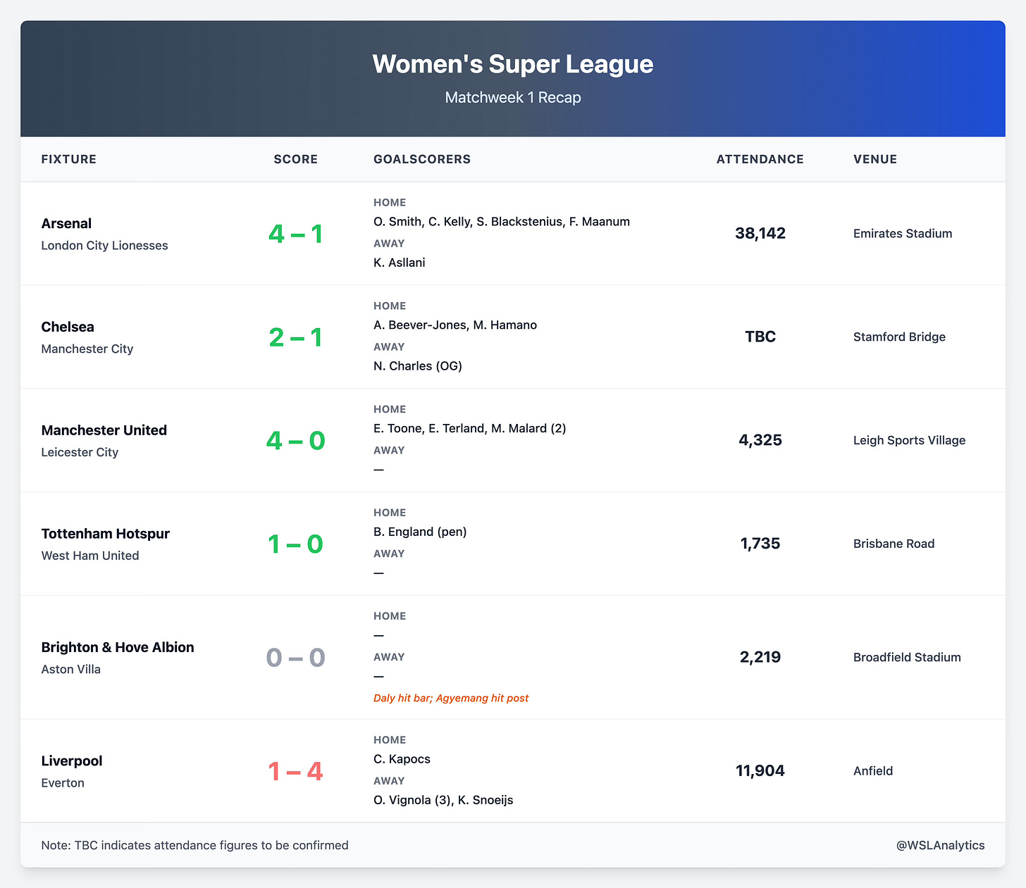 Beyond the results, Matchweek 1 brought records (38k+ at the Emirates), dream debuts (Vignola’s hat-trick, Nnadozie’s clean sheet) and clutch performers (Mead, Malard, Carpenter) defined the weekend.