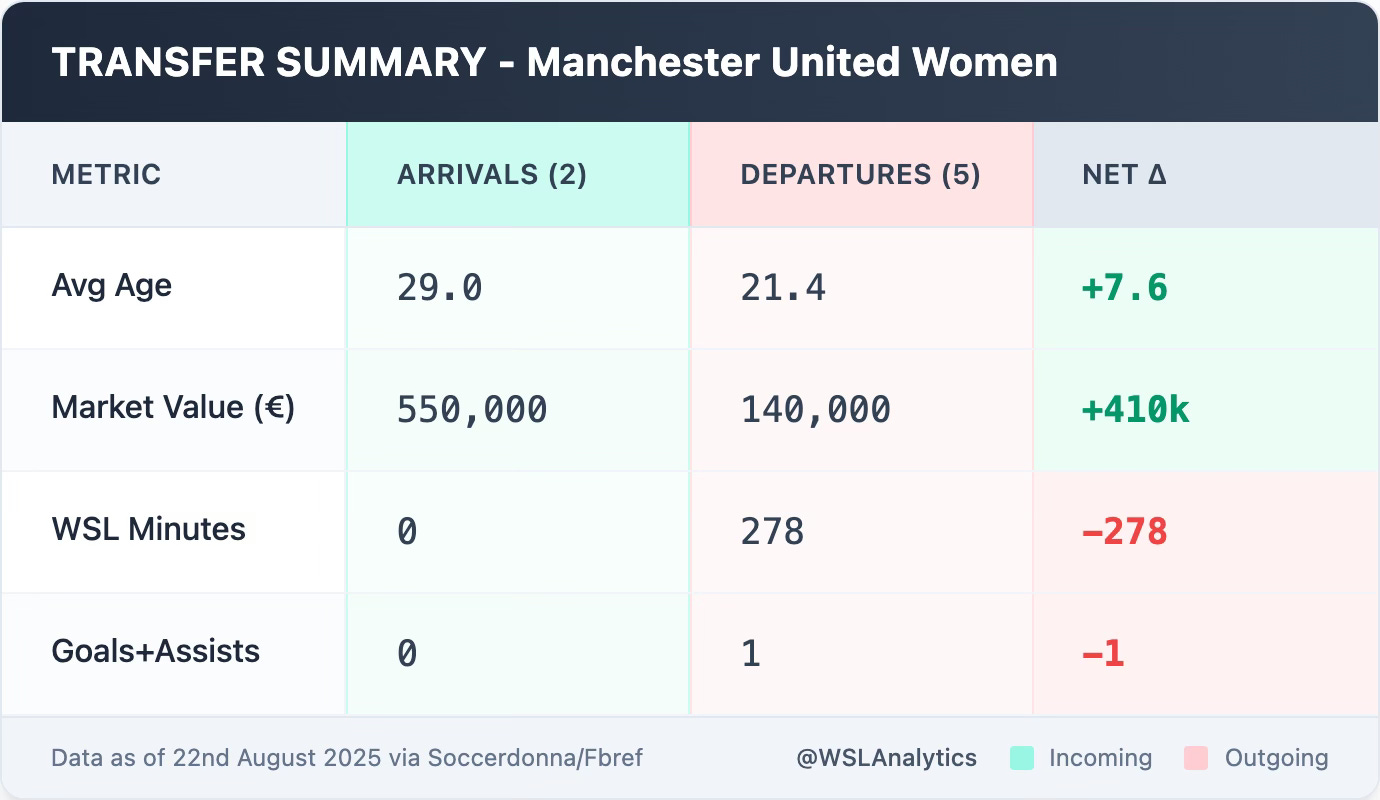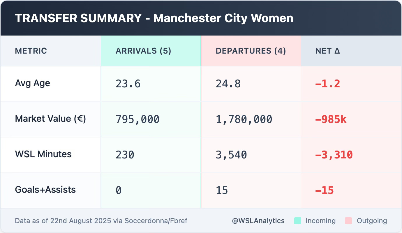 Replacements bring younger profiles and some WSL experience (Woodham, Kerr) but lack equivalent production.