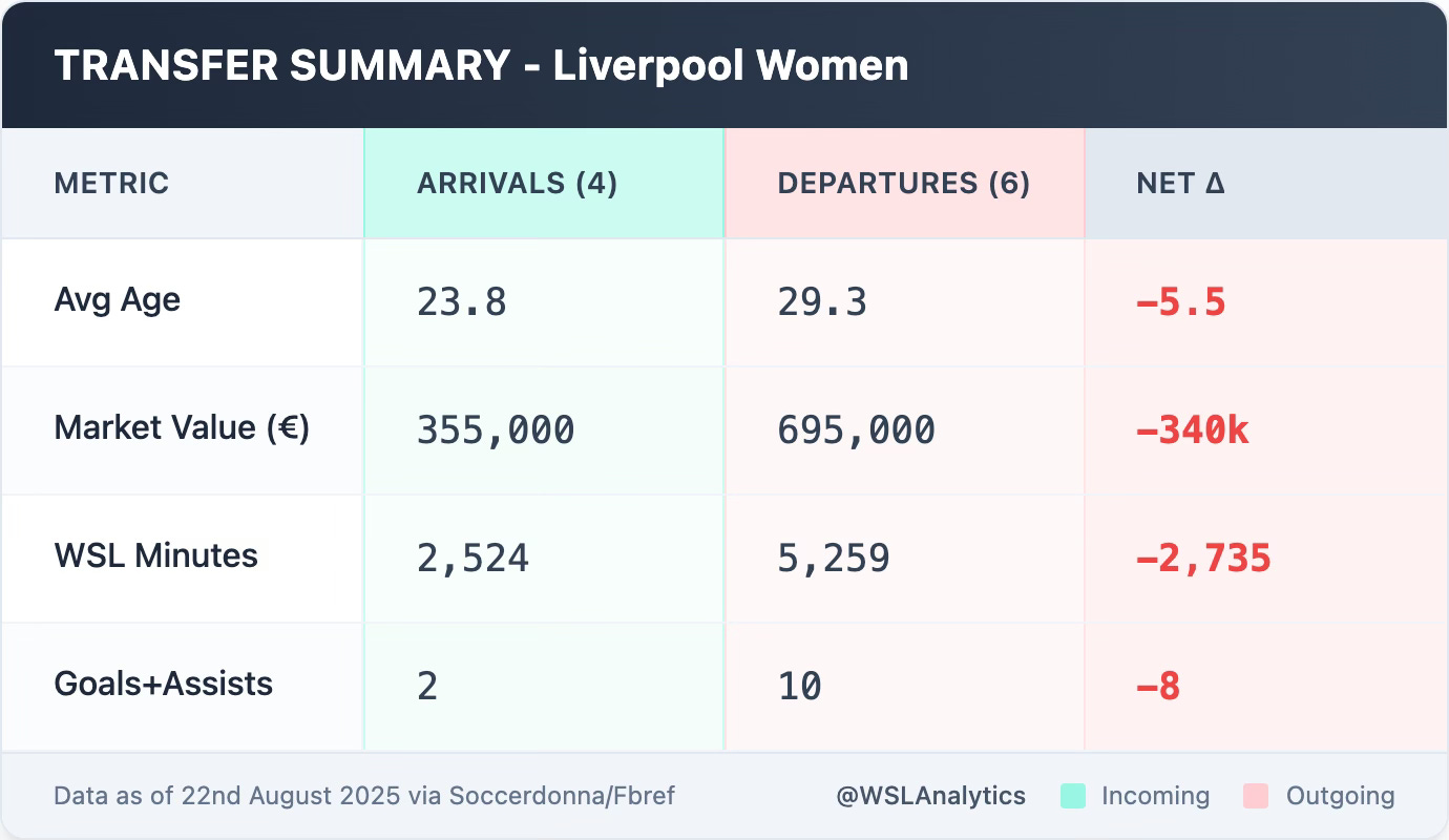 Liverpool and Manchester City lose proven starters, while London City make bold splashes. Data-driven analysis of every signing's impact on WSL minutes, goals, and market value.