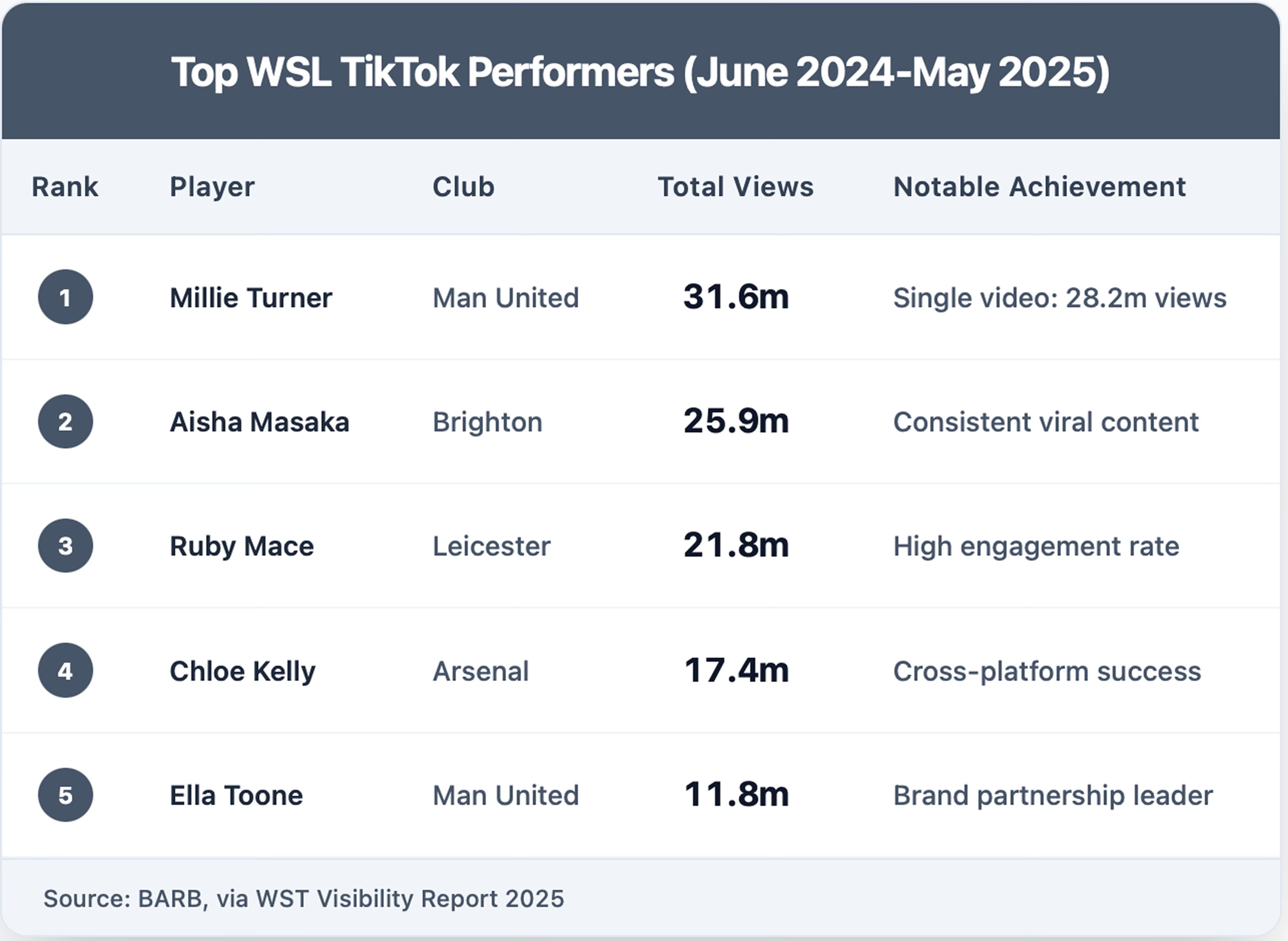 Millie Turner emerged as the WSL's biggest TikTok star, accumulating 31.6 million views across 282 video uploads—more content than any other WSL player. Her most viral video alone generated 28.2 million views, proving individual players can drive massive engagement.