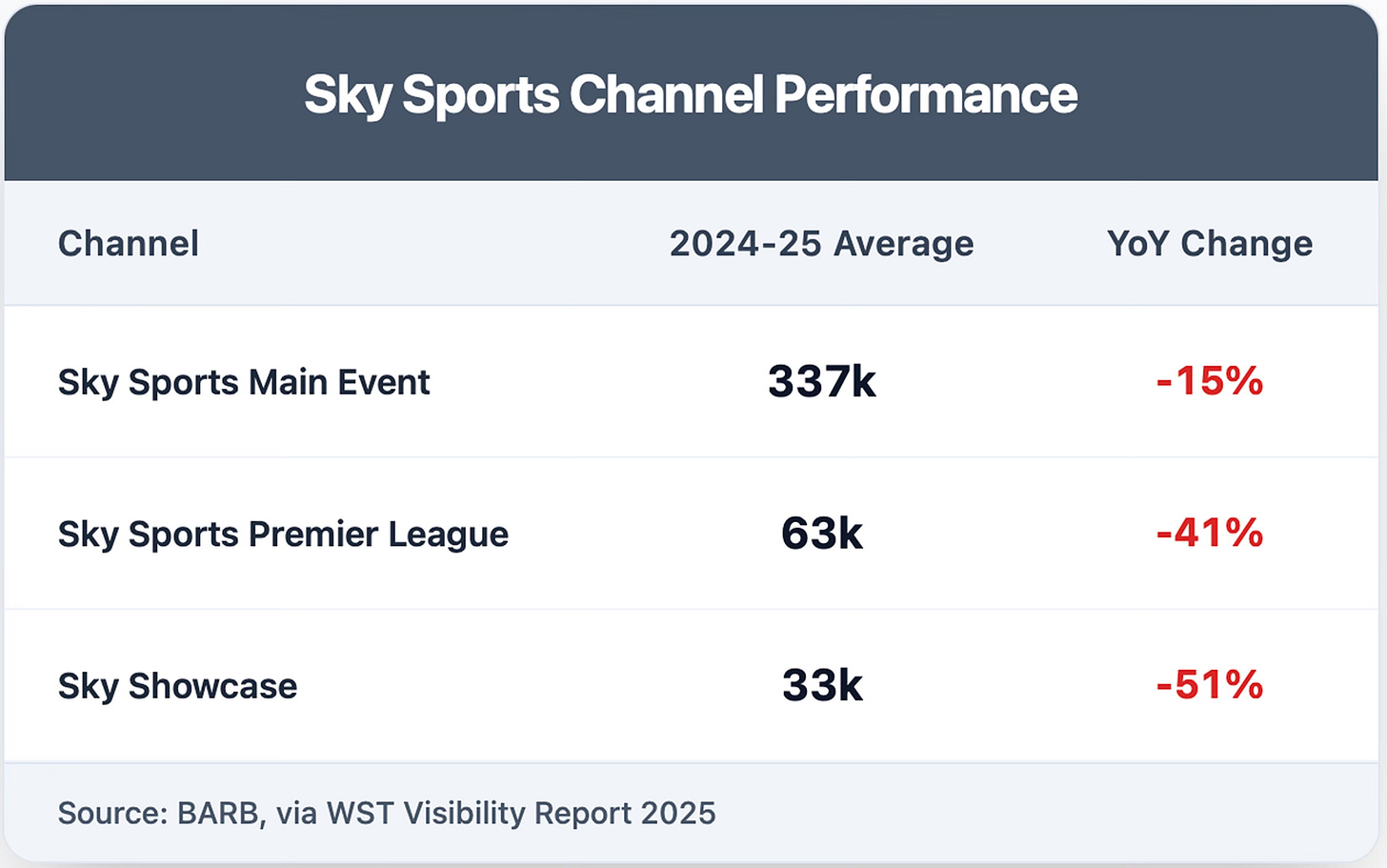 The decline wasn't uniform across all platforms. BBC One remained remarkably stable, averaging 682k viewers per match (only -2% from 2023-24), proving that free-to-air accessibility continues to drive substantial audiences. The primary drop occurred on Sky Sports channels, where the average fell from 396k to 337k (-15%).