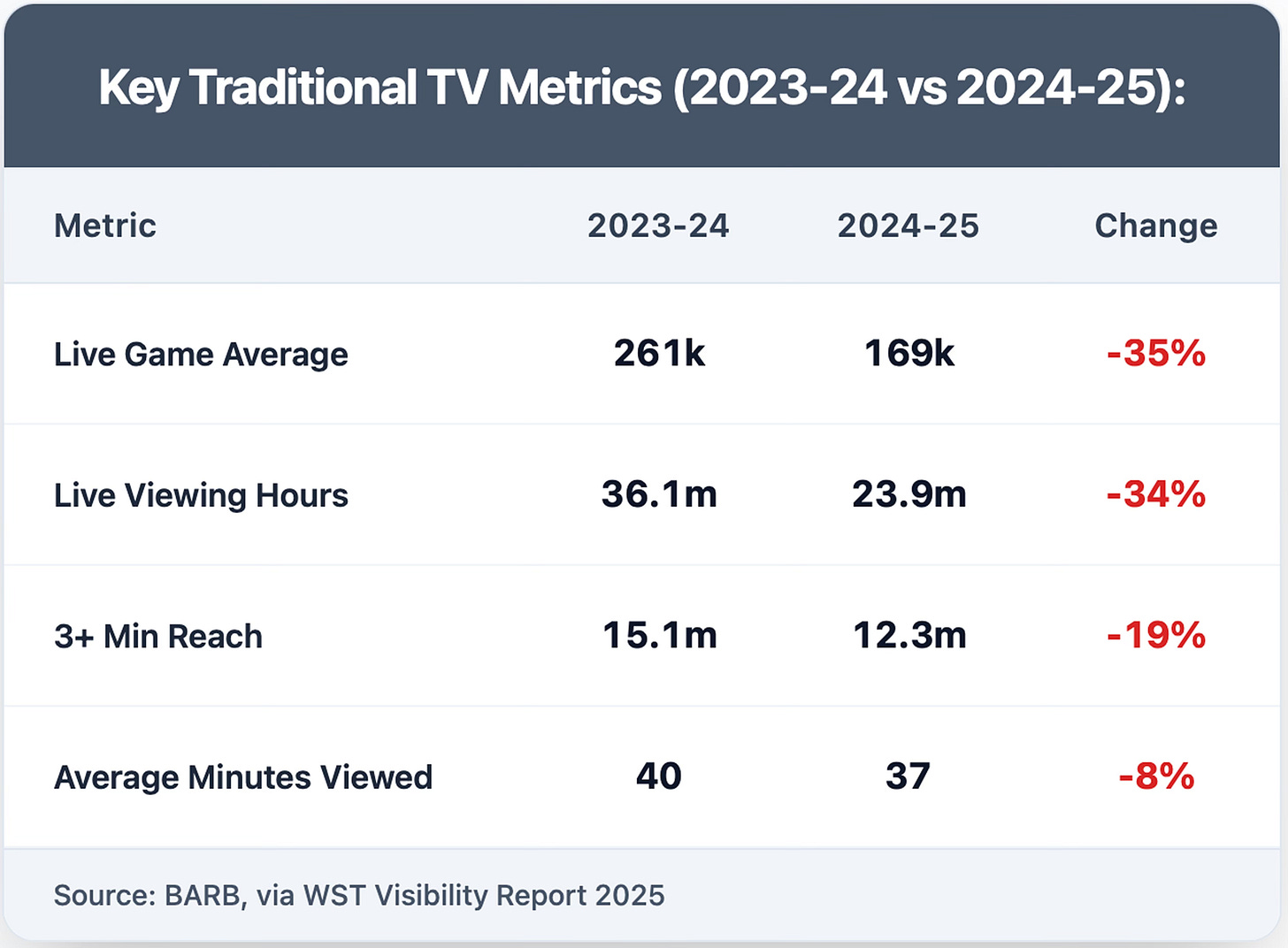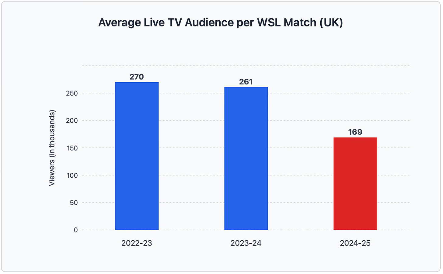 Traditional television viewership dropped from 261k to 169k average viewers per match—a steep 35% decline that demands examination. However, this wasn't unique to women's football: men's Premier League audiences also fell 9% year-on-year, indicating broader shifts in viewing habits rather than declining interest in the WSL specifically.