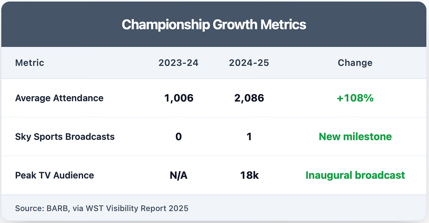 While WSL traditional broadcasting faced challenges, the Women's Championship achieved remarkable growth. Attendance doubled to 2,086 per match (+108% YoY), and the league secured its first-ever Sky Sports broadcast with the title decider between Birmingham City and London City Lionesses drawing 18k viewers.