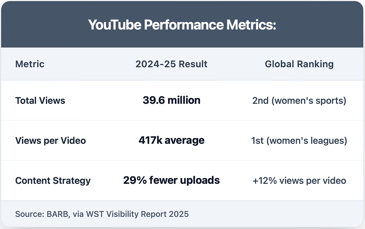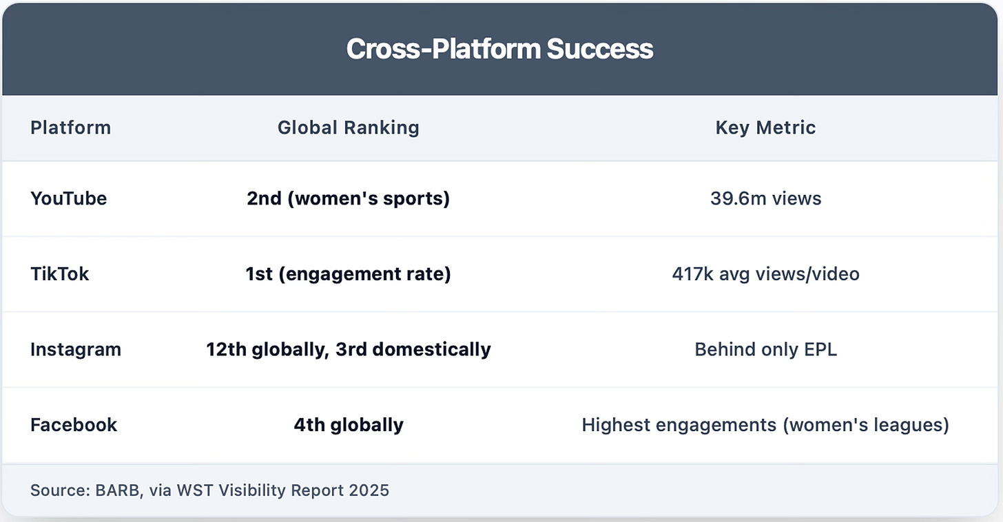 The WSL's decision to move 70 live matches from the FA Player to YouTube proved transformative. The Barclays WSL YouTube channel achieved 39.6 million views in its inaugural season, immediately establishing itself as the second-highest viewed women's sports property globally behind only the WTA.