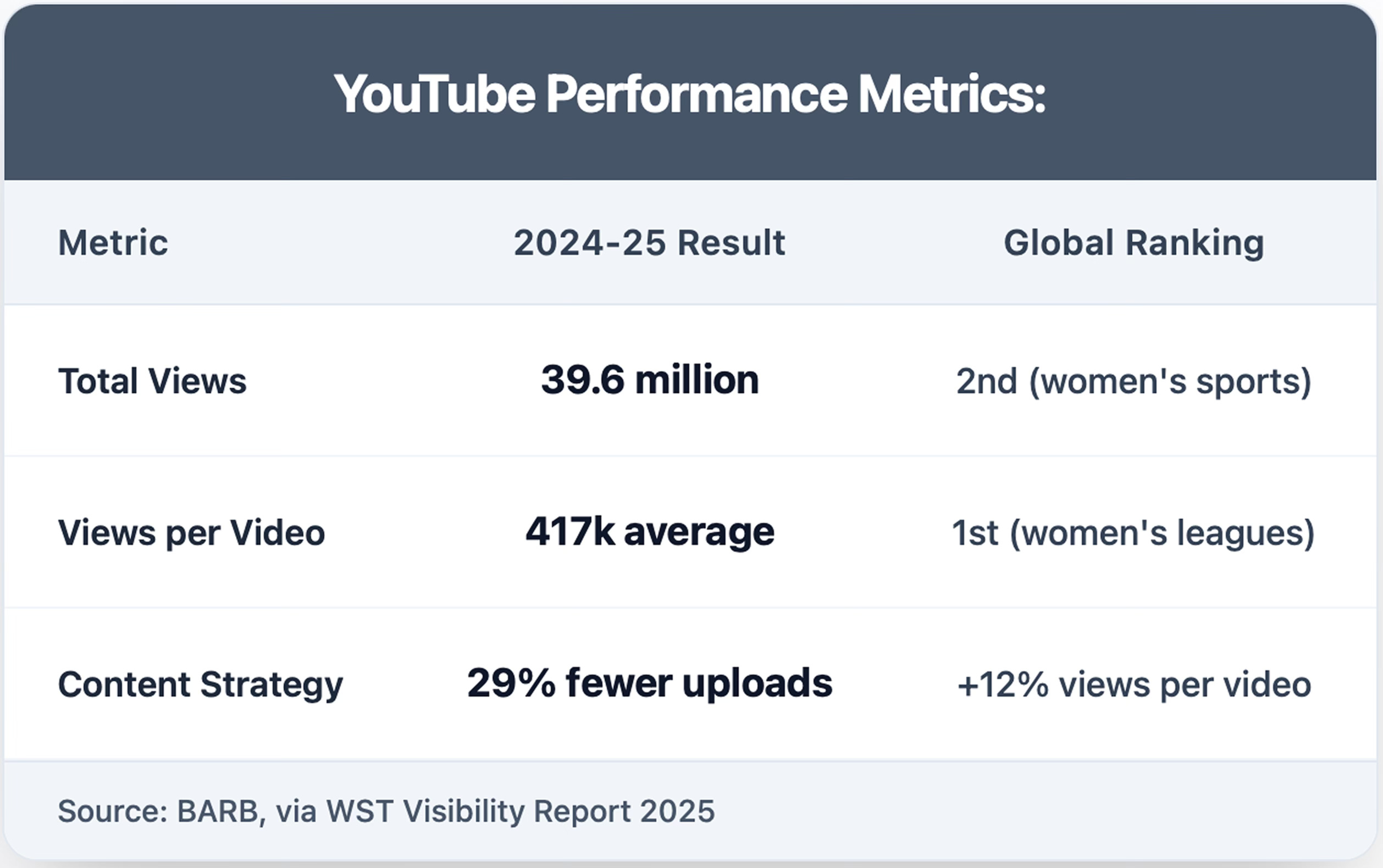 Highest views per video (417k) of any major women's sports league globally