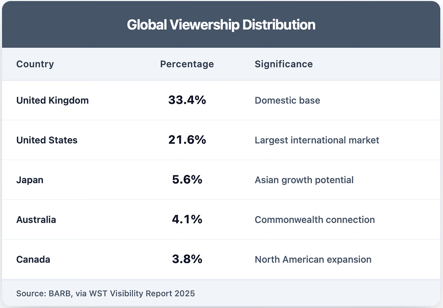 YouTube analytics revealed the WSL's remarkable global penetration. Despite being a domestic English league, only 33.4% of YouTube viewership came from the UK. The remaining two-thirds came from: