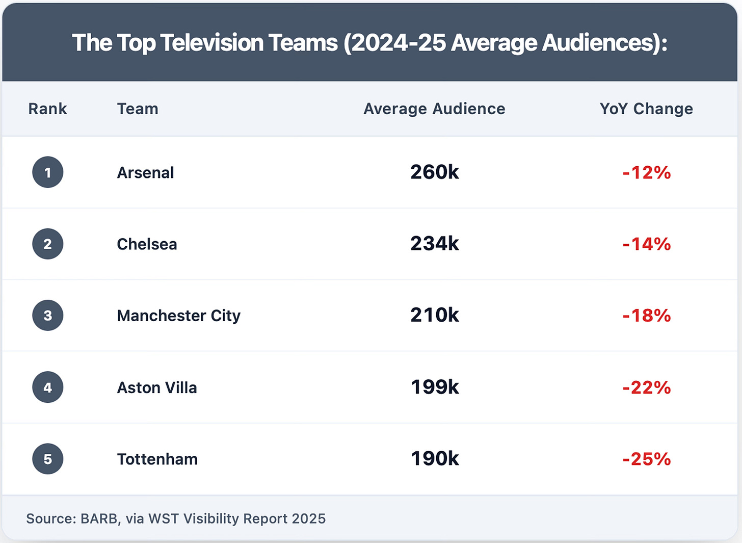 Remarkably, every single team that competed in both 2023-24 and 2024-25 saw declining average audiences, ranging from Arsenal's manageable -12% to Leicester City's dramatic -83%. This universal trend reinforces that external factors—rather than club-specific issues—drove the overall viewership decline.